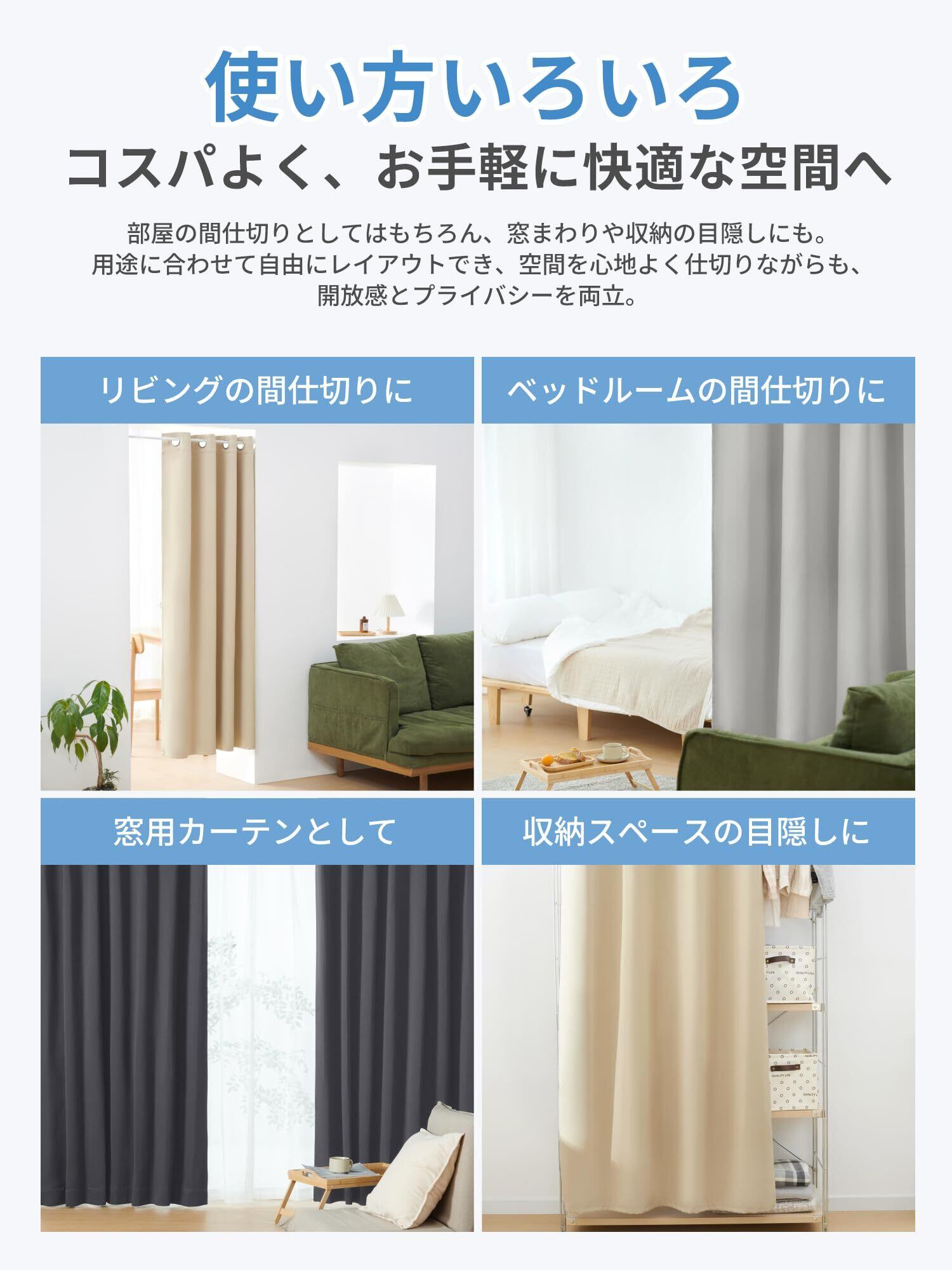 【取付簡単・多用途】ハトメ付きで突っ張り棒を通すだけで簡単に取り付け可能。フックやネジ穴は不要で、開け閉めの横滑りがスムーズに動かせます。使用しない時は端にまとめてコンパクト◎、通行の邪魔になりません。玄関や廊下、階段、キッチン、リビング、ベッドルーム、洗面所、押入れなど、さまざまなシーンや場所で活用できます。