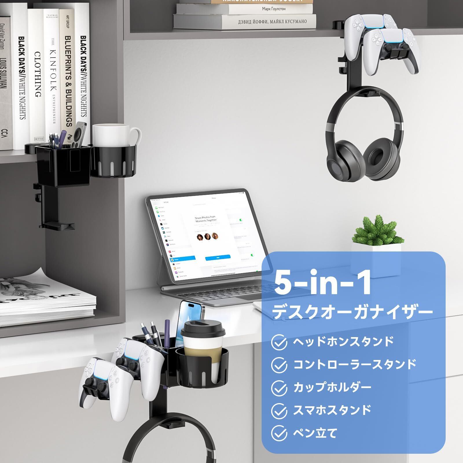 KDD 5 in 1デスクオーガナイザー — 回転式ヘッドホン スタンド付きドリンクホルダー デスク — ヘッドホン掛け 取り外し可能なコントローラー スタンド — ペン立てとカップホルダー付き 簡単設置 安定性 — ヘッドホンハンガー 卓上収納がカップ、スマホ、ペン、コントローラーとヘッドホンに適用(黒い)