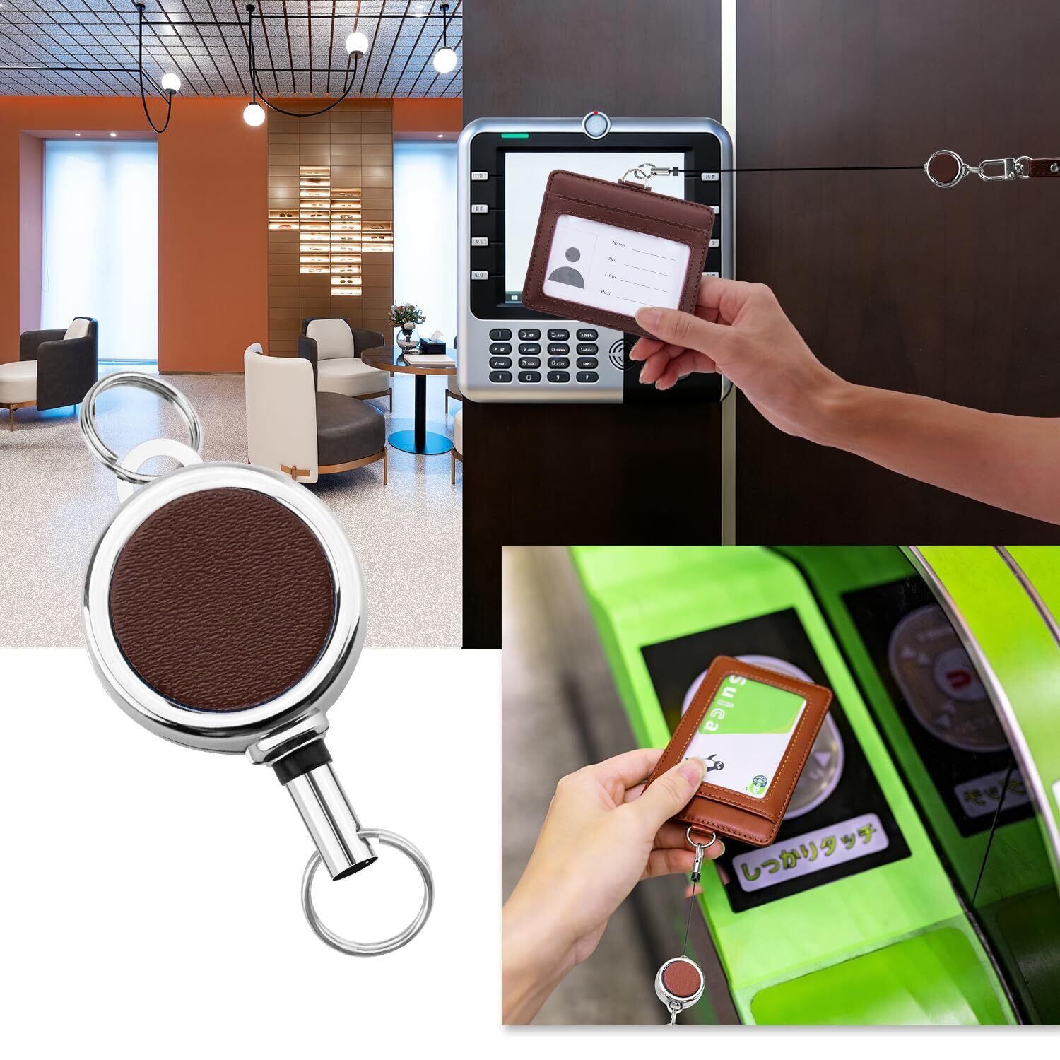 【伸縮リール付のIDカードホルダー】ストラップには、巻き取り式のリードが内蔵されていて、カードを引っ張ると36.8センチほど伸びます。巻き戻しが強く引っ掛かりも無く、スムーズに伸びるリールの紐は特殊強化タイプで、切れにくく丈夫で長持ちする点も魅力です。ストラップの長さを調整可能、手を離すと自動的に戻ります。保安エリアでID認証する際に首にかけたまま届く構造です。定期券に応用すれば、リードを引っ張るだけで改札機にタッチできる便利さもあるでしょう。リールボディは同じ色の素材で構成されており、見た目も美しいデザインです。どのような服装、小物にもマッチしますので、男女問わずに活用でき、また世代を超えて幅広い年齢層にお使いいただけます。ホルダーとネックストラップの間の伸縮性リールが日常での使い勝手を向上させています。