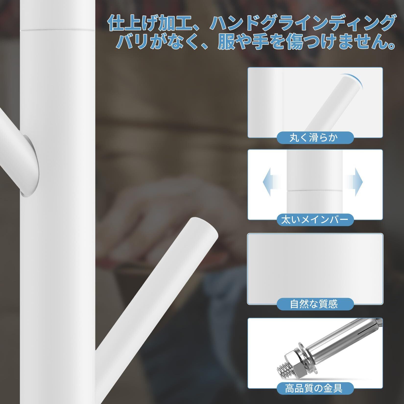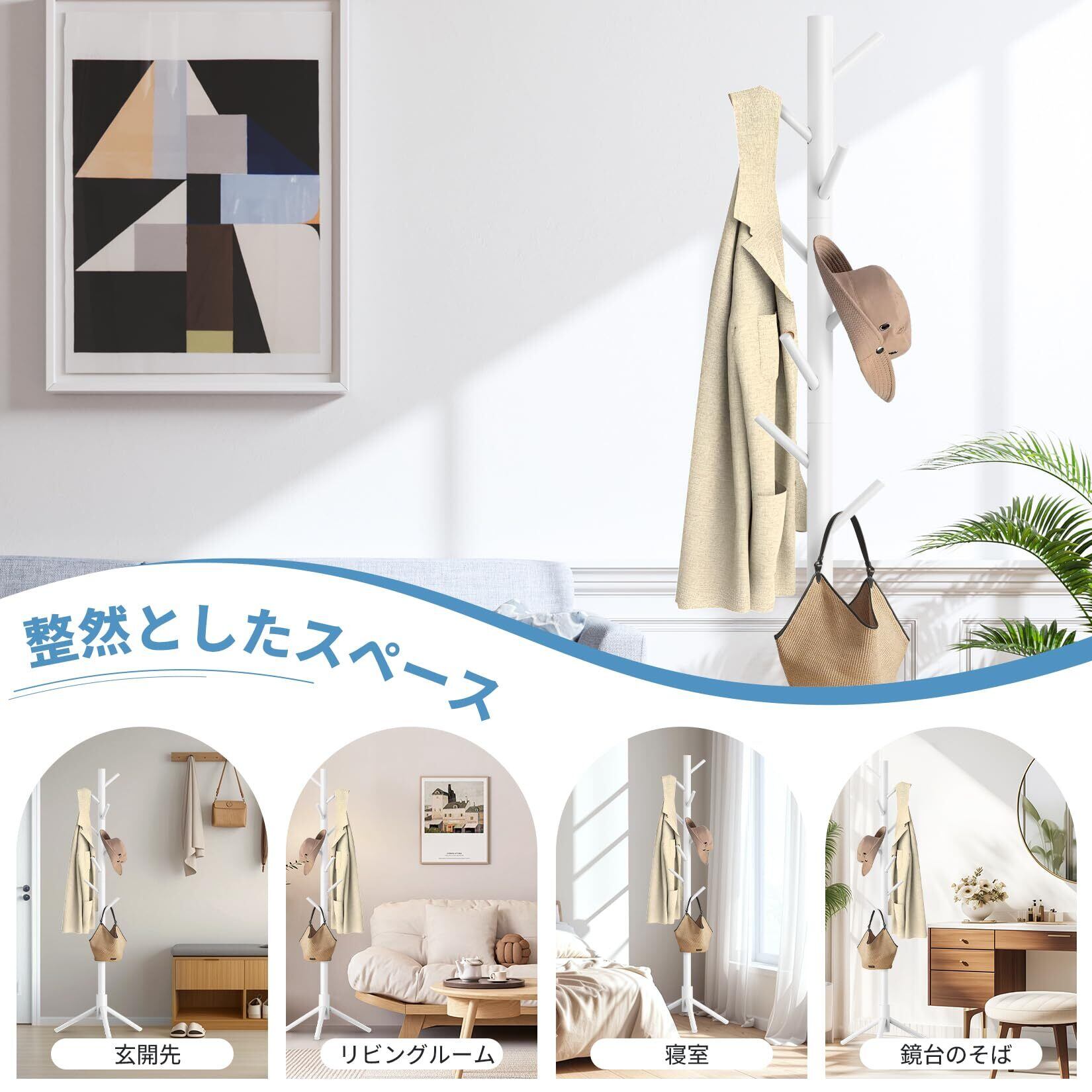 ポールハンガー 木製 コートハンガー かばん掛け ポール 子供 ハンガースリム 洋服掛けポール おしゃれ 帽子掛けスタンド バッグ掛け 8つフック 衣類収納 玄関ハンガー 高さ調節可能 高い安定感 高さ175cm 組立て簡単 玄関 リビング 寝室(ホワイト)