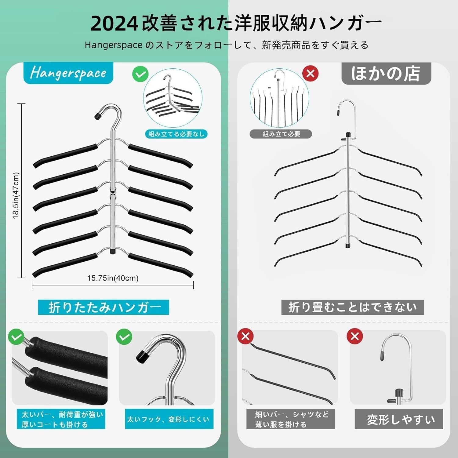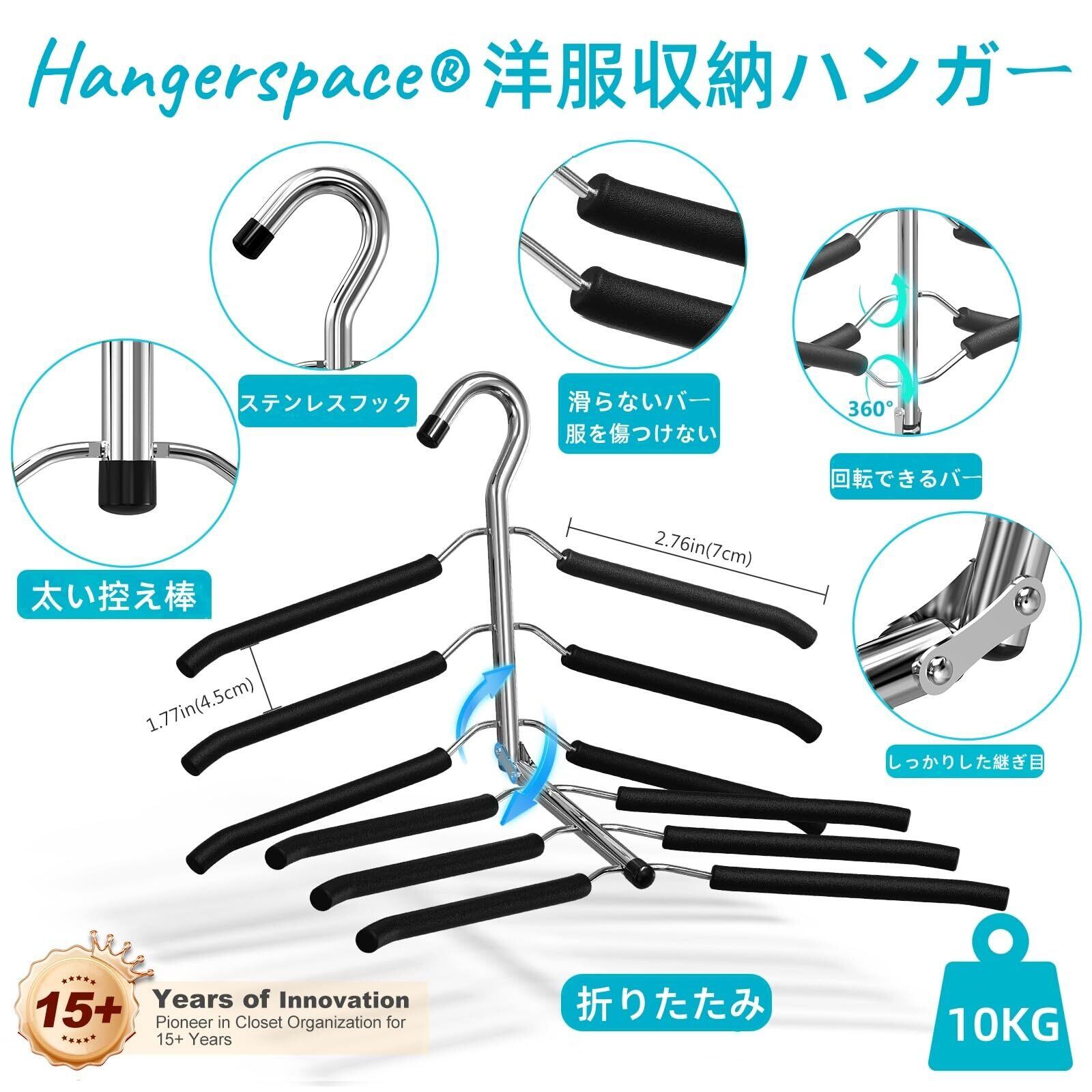 Hangerspace ハンガー 収納 かたくずれ防止 洋服収納 ステンレス 滑らない 省スペース 跡がつかない ワイシャツ Tシャツ コート セーター 折り畳みハンガー 衣類収納 クローゼット 6段 幅40cm 2本組