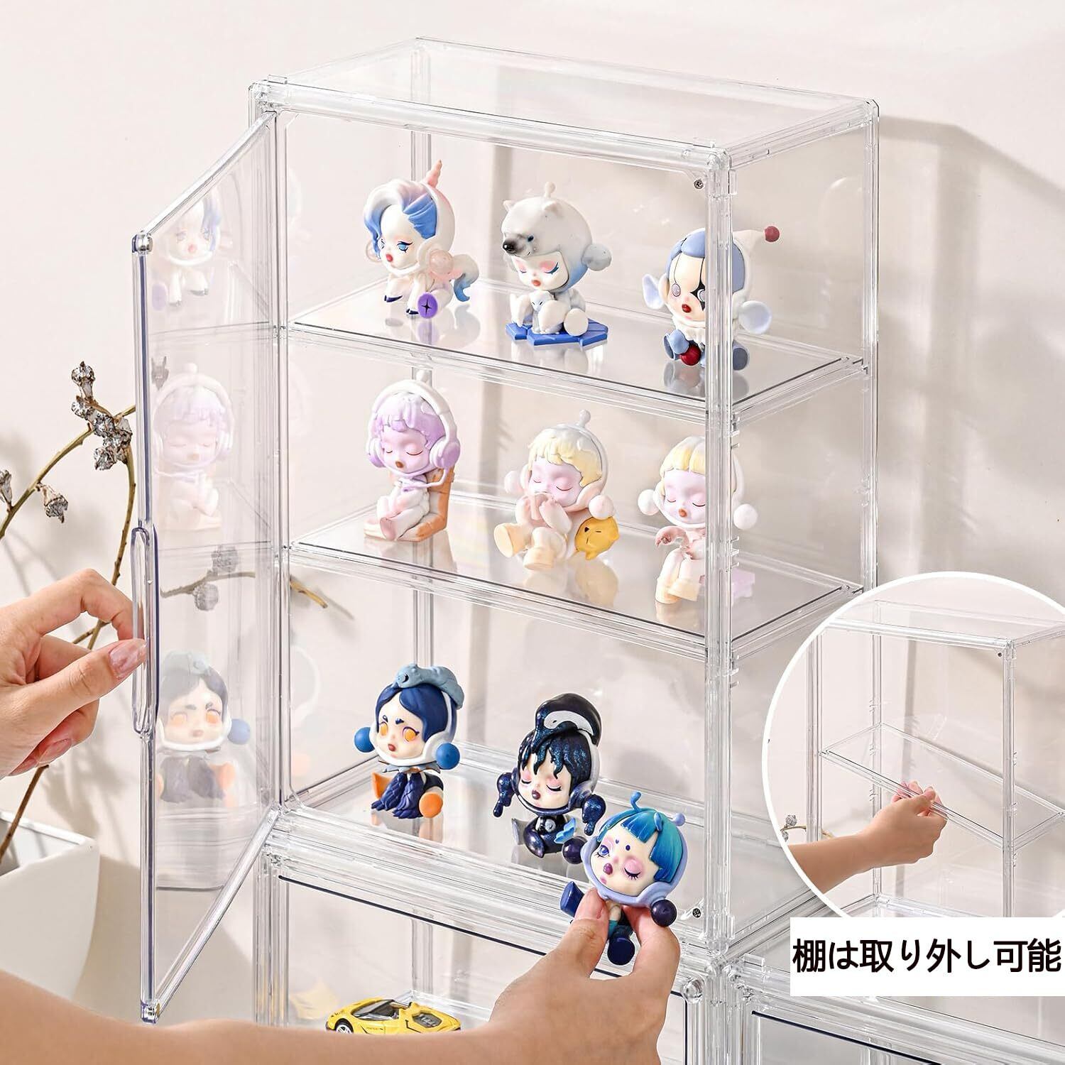 【プレミアム素材】アクリル素材。ワンタッチでアクセスできるマグネット扉で、コレクションを埃から守り、高い視認性を確保します。密閉性により理想的な収納環境を実現し、連結溝付きの設計により、ディスプレイケースを積み重ねることができ、スペースを最大限に活用しながら様々なコレクションを展示できます。