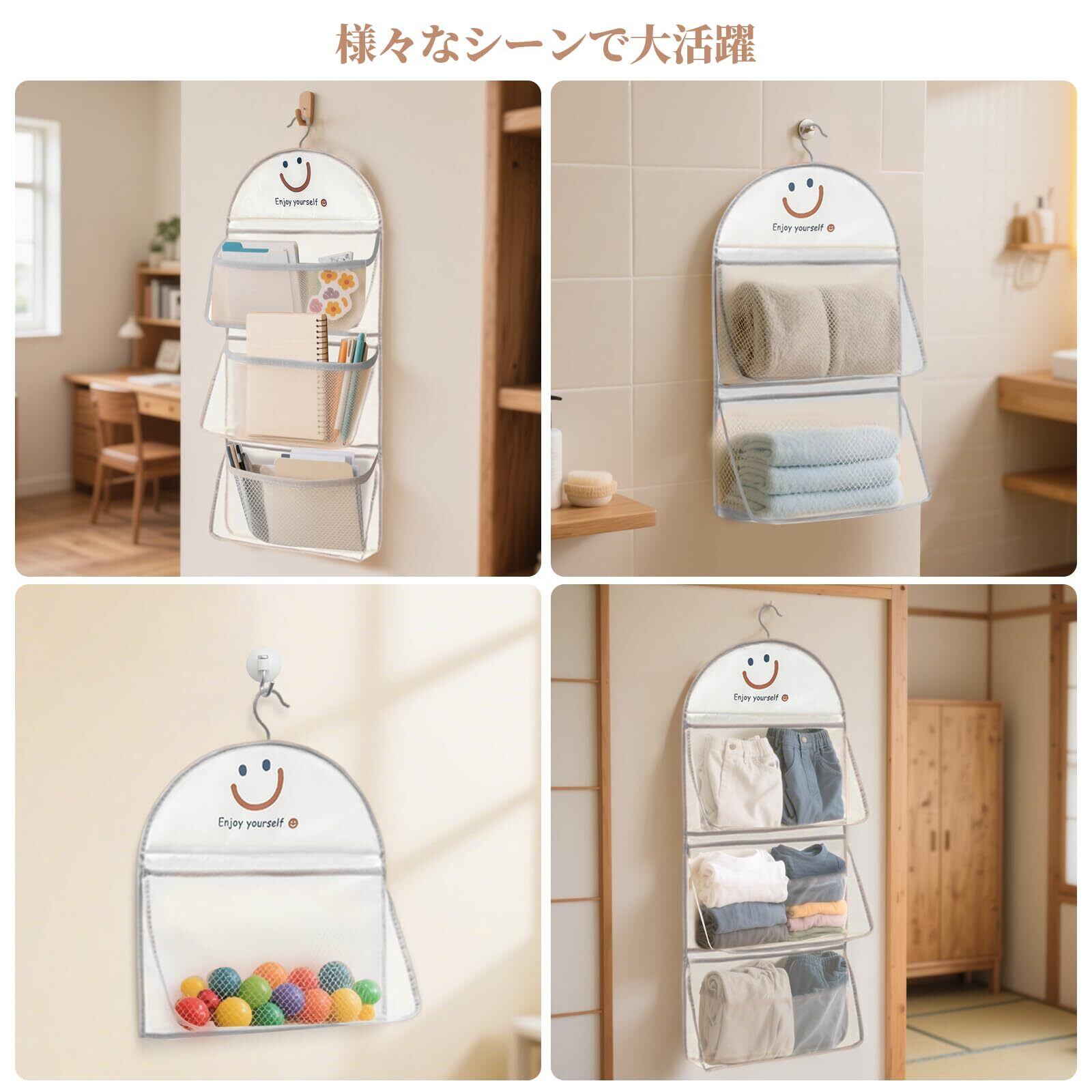 下着収納 ウォールポケット 下着 収納 クローゼット 2個セット 吊り下げ収納 大容量 靴下 ネクタイ 衣類 階層式収納バッグ 水洗い可能 ウォールポケット 壁掛け 回転可能フック付き 折りたたみ 省スペース 3段 笑顔柄 グレー