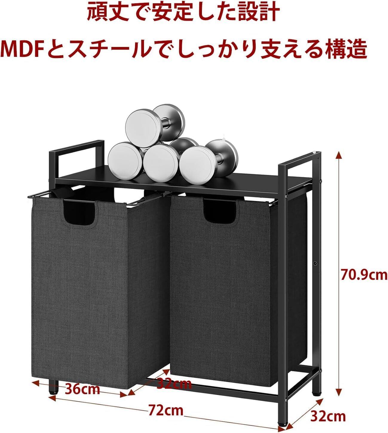 【取り外し可能な洗濯カゴ — ランドリー収納】2つの洗濯カゴはフレームからワンタッチで取り外せ、持ち運びや丸洗いが可能。汚れや濡れ物もそのまま移動でき、清潔に保てます。家族別や色別仕分けにも便利です。