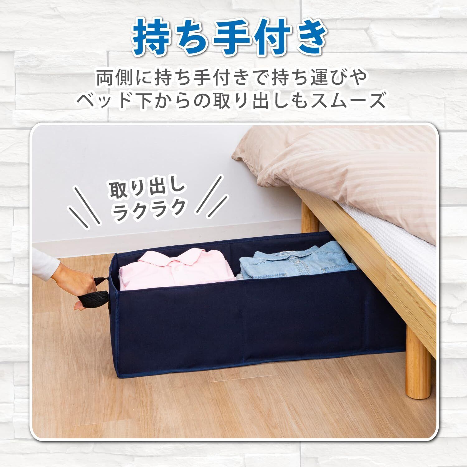 【持ち手付き・トランクやクローゼット内でも使える】:両側に持ち手付きで持ち運びやベッド下からの取り出しもスムーズ。車のトランクの荷物の整理やクローゼット内の収納などにも使える。