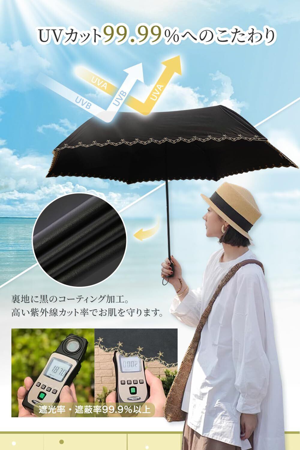 「UVカット&完全遮光」裏地に黒のコーティング加工を施し、遮光率100%、紫外線遮蔽率99.99%以上の遮光日傘です。有害紫外線や日差しからお肌を守り、日焼け防止、暑い夏の熱中症対策にも役立ちます。