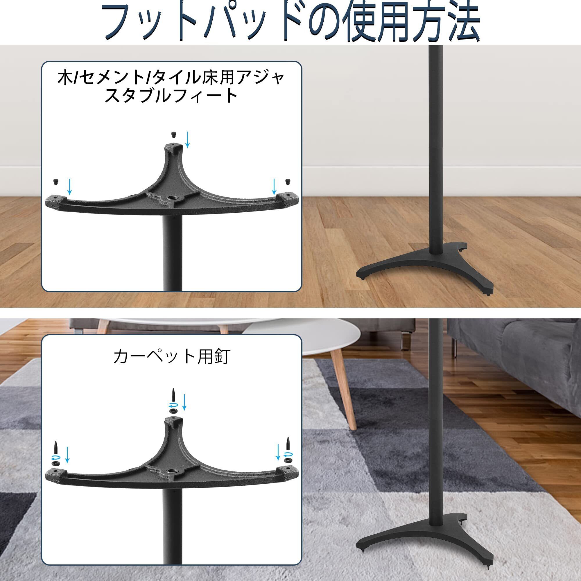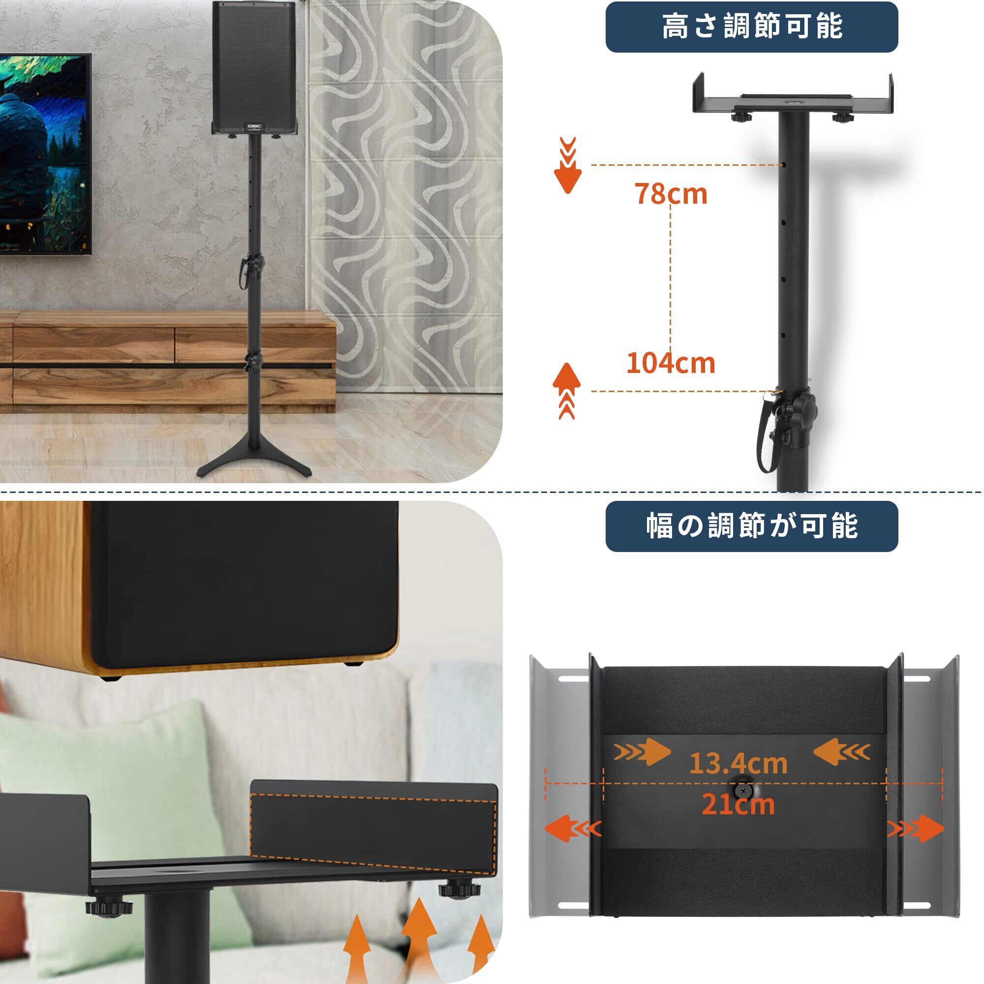 【製品情報】78 cm〜104 cm高さ調整、天板奥行13 cm x幅(13.5〜21)cm、ほぼすべてのスピーカー、荷重能力:15 kg