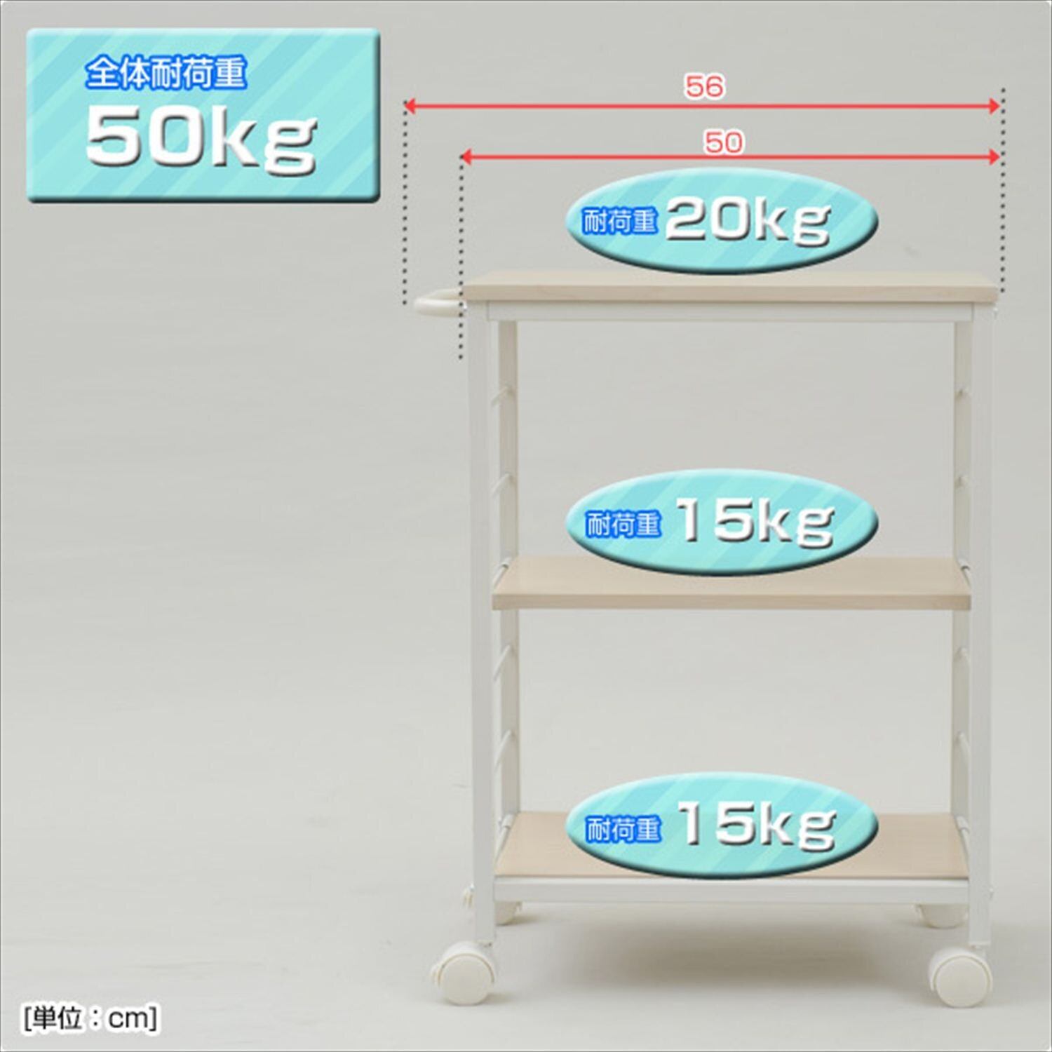 全体耐荷重:50kg(天板耐荷重/20kg、棚板耐荷重/各15kg)