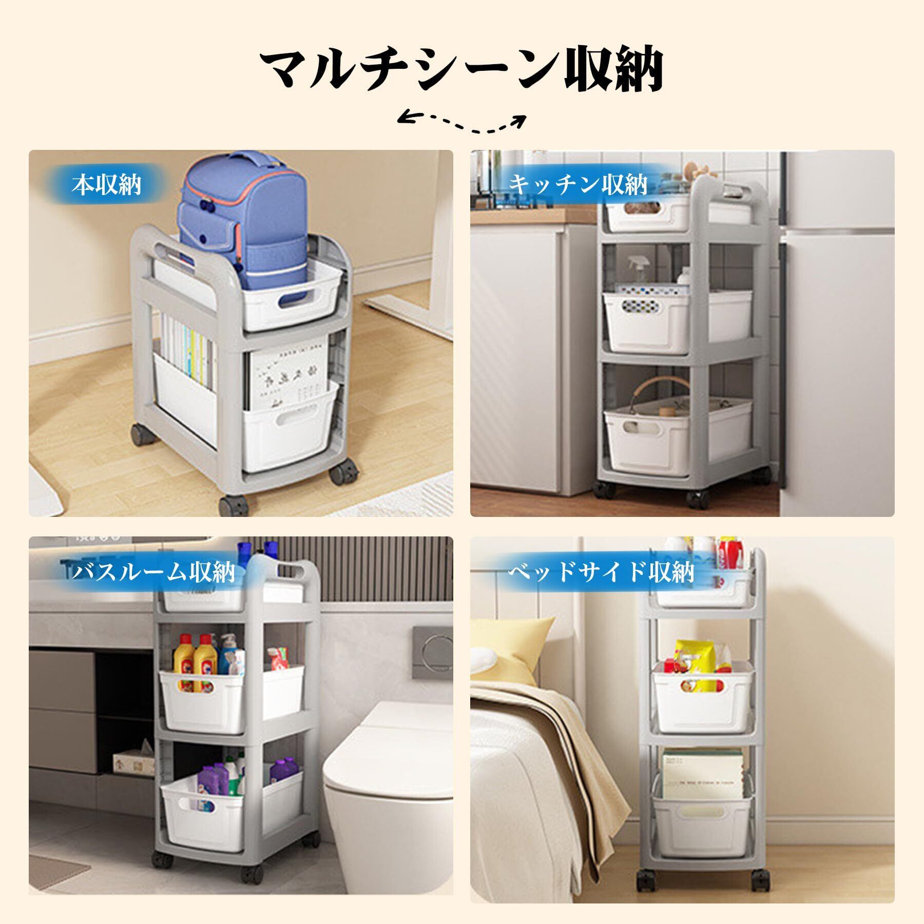 【キャスター付き・360度回転】360度回転するキャスターにはリミッターが付いており、用途に合わせて簡単に移動・位置変更が可能です。引き出しや持ち運びに便利なハンドル付き。プラスチック素材で作られており、防水性、防湿性、防錆性に優れており、キッチンや浴室でもご使用いただけます。お手入れも簡単で、布で拭くだけです。