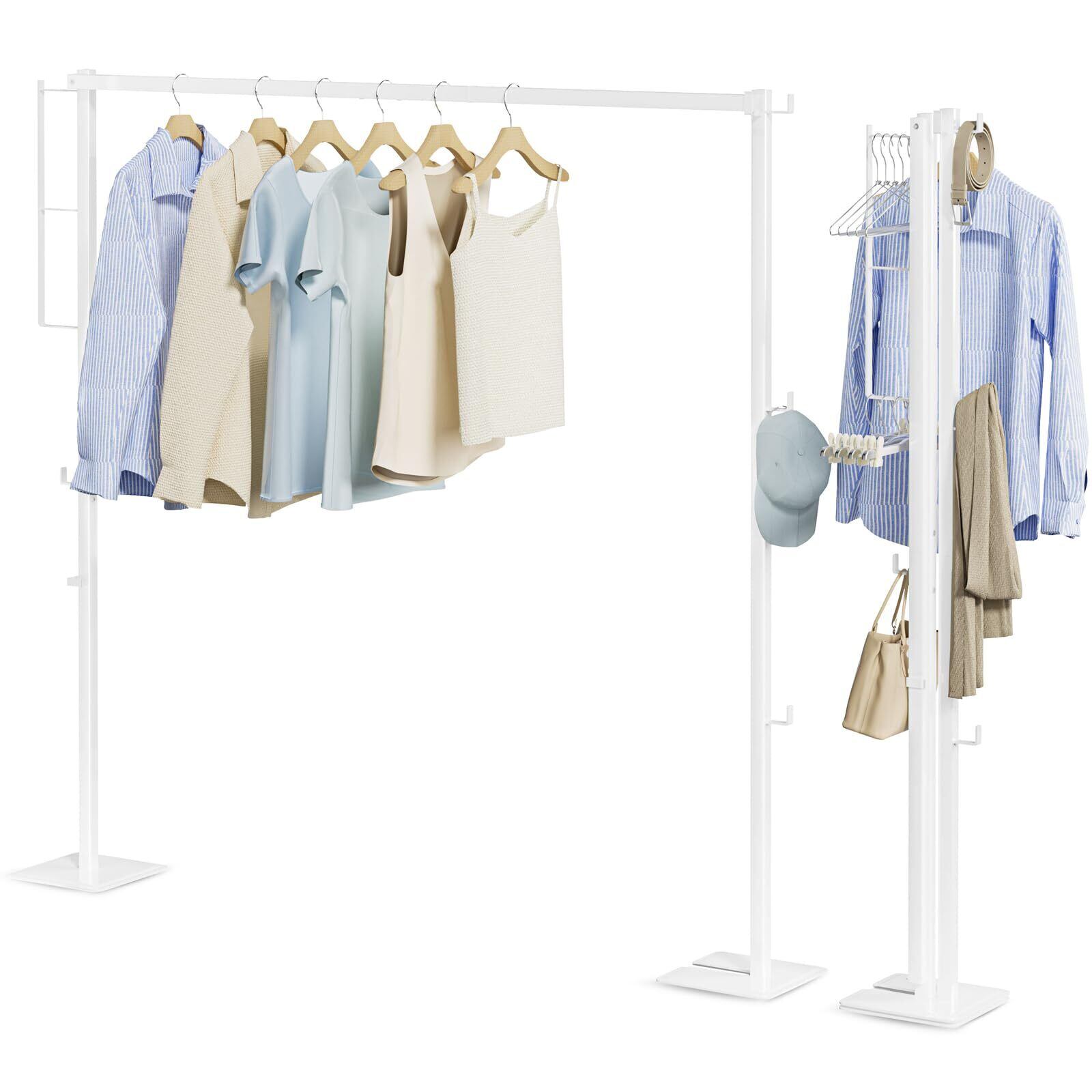 多機能フックで収納力抜群。支柱には使わないハンガーを掛けられるフックがあり、横のフックで洗濯物を種類別に整理できます。小さなフックには角ハンガーや洗濯バサミを掛け、収納時もバッグや帽子などをサッと掛けられます。折りたたみ時もフックを活用でき、使い勝手が非常に良いです