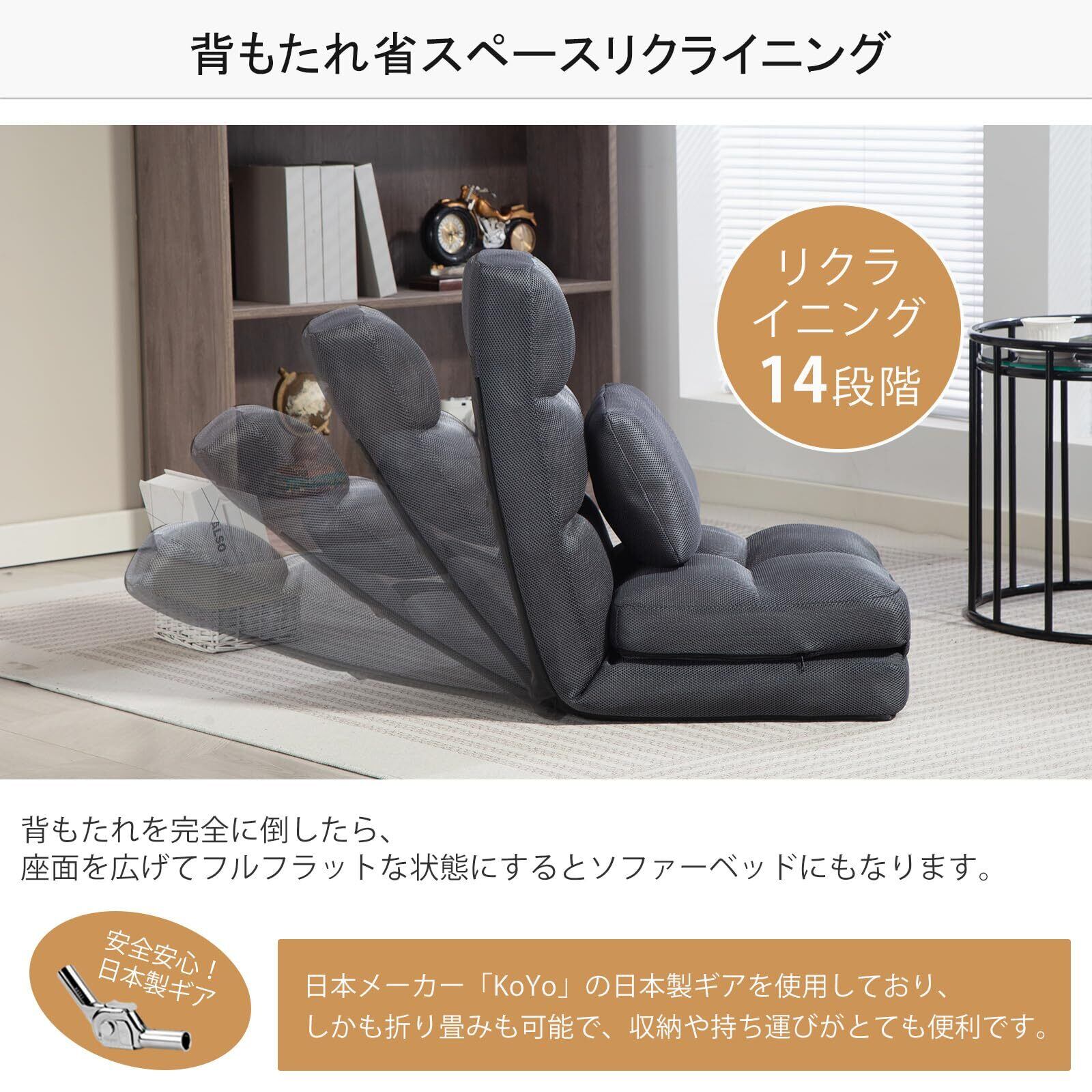 【リクライニング座椅子】背もたれは14段階を角度調節でき、折り畳みも可能です。日本メーカー「KoYo」の日本製ギアを使用しており、コンパクトで収納や持ち運びがとても便利です。フルフラットな状態にするとソファーベッドにもなります。