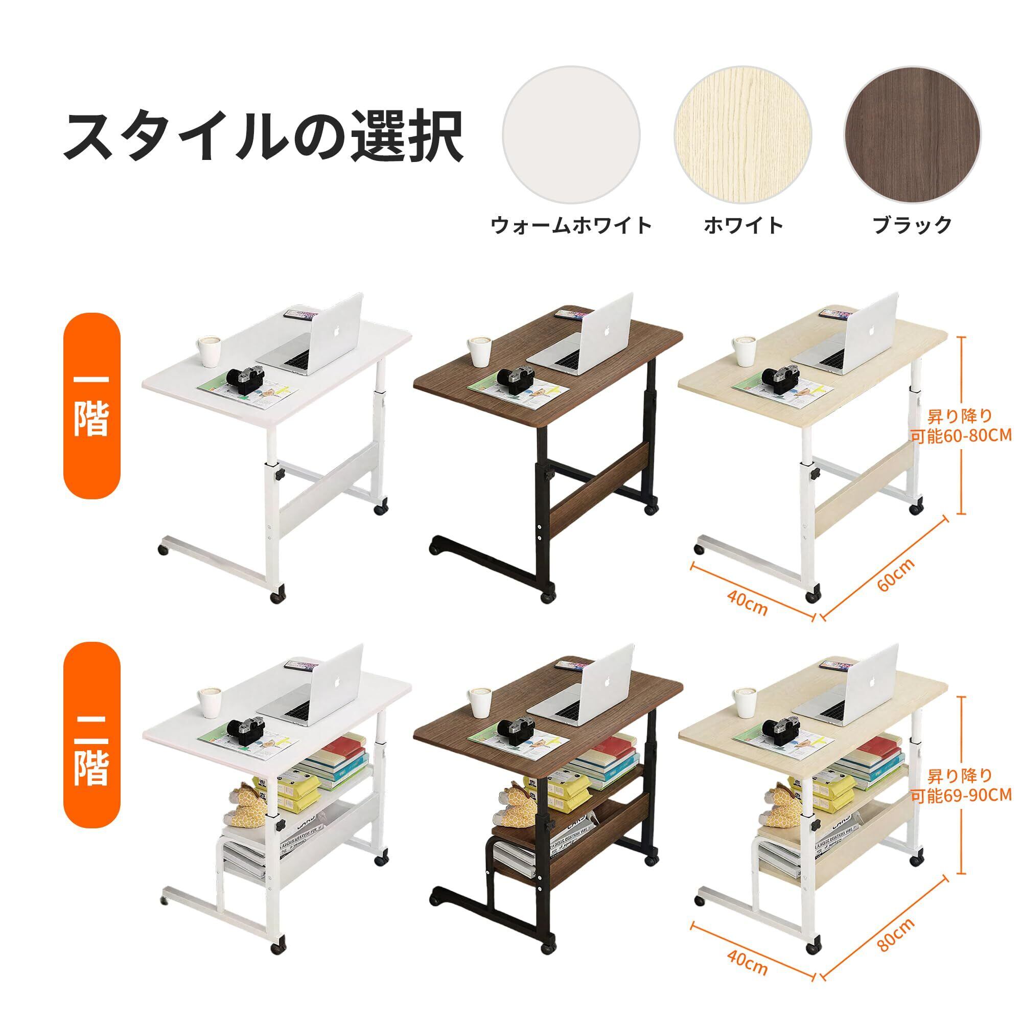 サイドテーブル ベッドテーブル キャスター付き 移動式 昇降式サイド サイドデスク 高さ調節 組み立て簡単 省スペース 作業台 安定性 角が丸い 移動便利 パソコン ソファサイド ベッドサイドデスク 多機能 家庭用 ウォームホワイト 二段 (BK, 8040*2)