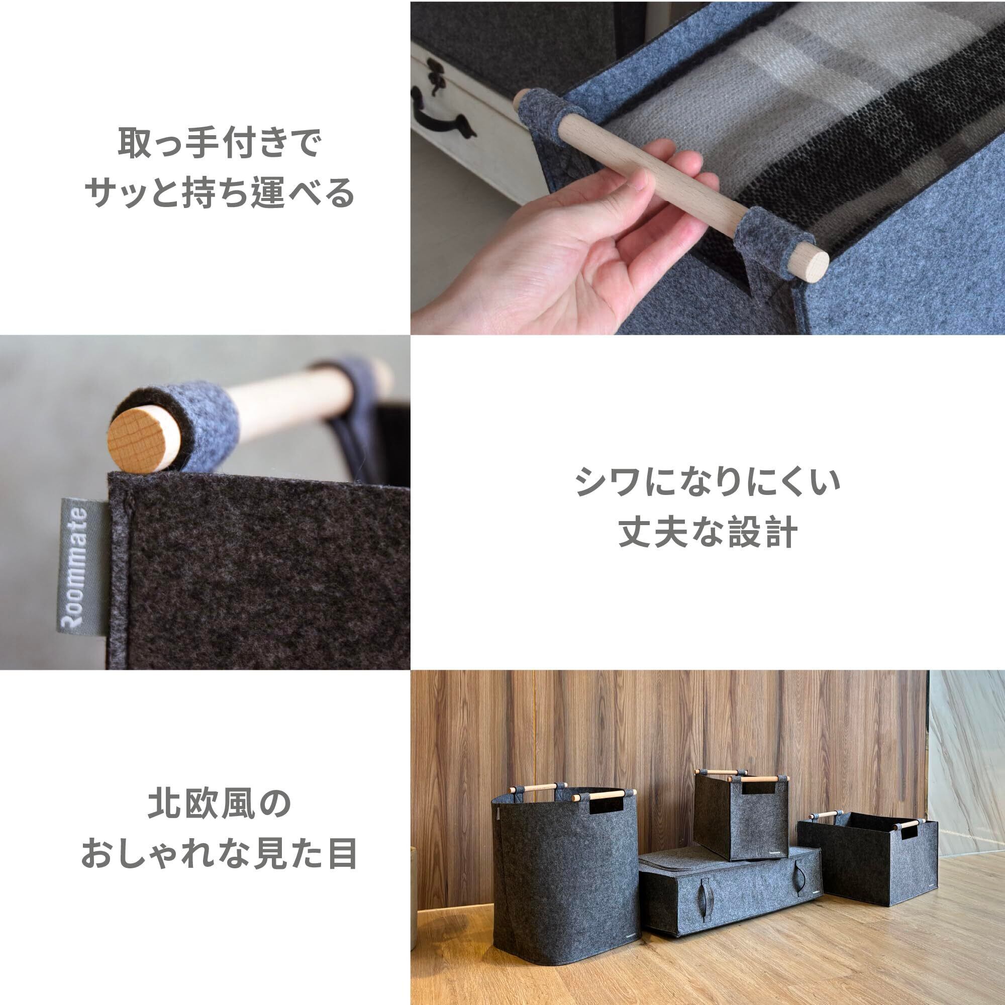 特徴 北欧風のやさしいデザイン, 厚さ3mmの高密度フェルト生地使用, 多用途対応の大容量ボックス, 天然ブナ材のログハンドル付き, 折りたたみ式&省スペース設計