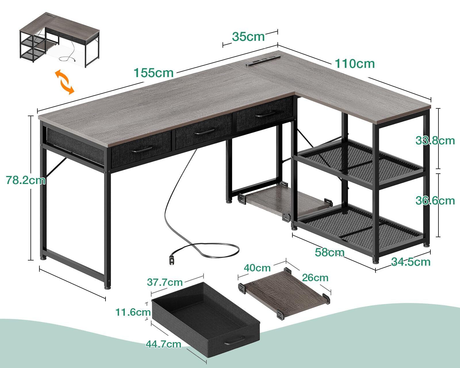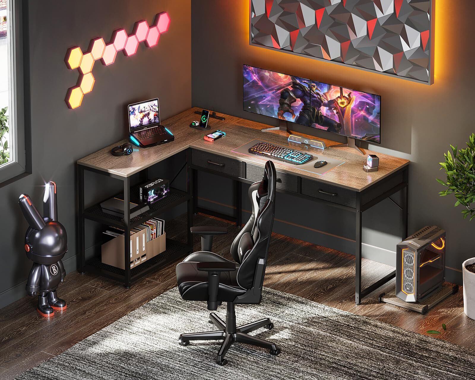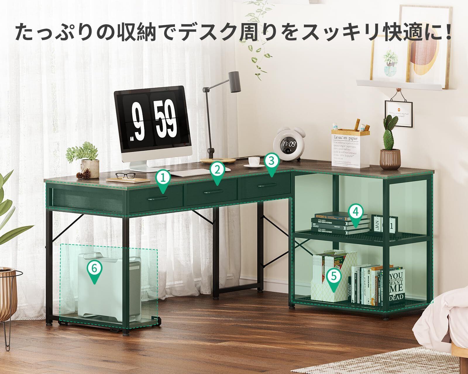 【引き出し3杯付きl字デスク・収納力満載】デスクの下には一体型の引き出しとラックが備え、本や書類などを使いたい時にサッと取り出せます。たっぷりの収納でデスク周りをスッキリ快適に!また、L字型のデザインで部屋のコーナーを最大限に活用でき、ご家庭でもオフィスでも、日常の仕事に十分なスペースを確保できます。