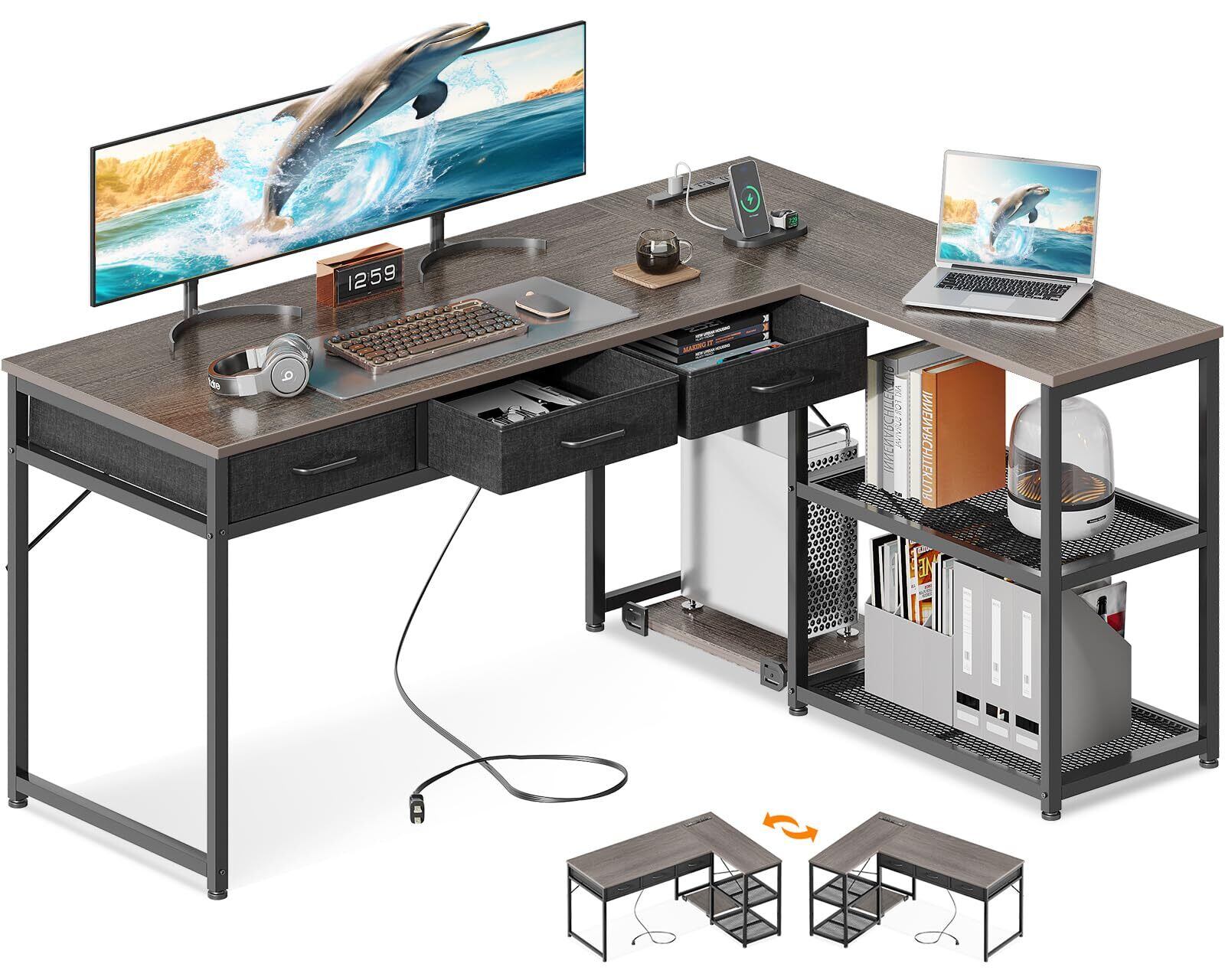 【コンセント付きデスク・ゲームと仕事両立】パソコンデスクとしてはもちろん、ゲーミングデスクとしても使用できるおしゃれなL字デスク。机には、2つのACコンセントとUSB ポート付きで、パソコンやスマホなどの充電ができて超便利です。また、ラックと引き出しは間取りや利き手に合わせて左右付け替え可能。