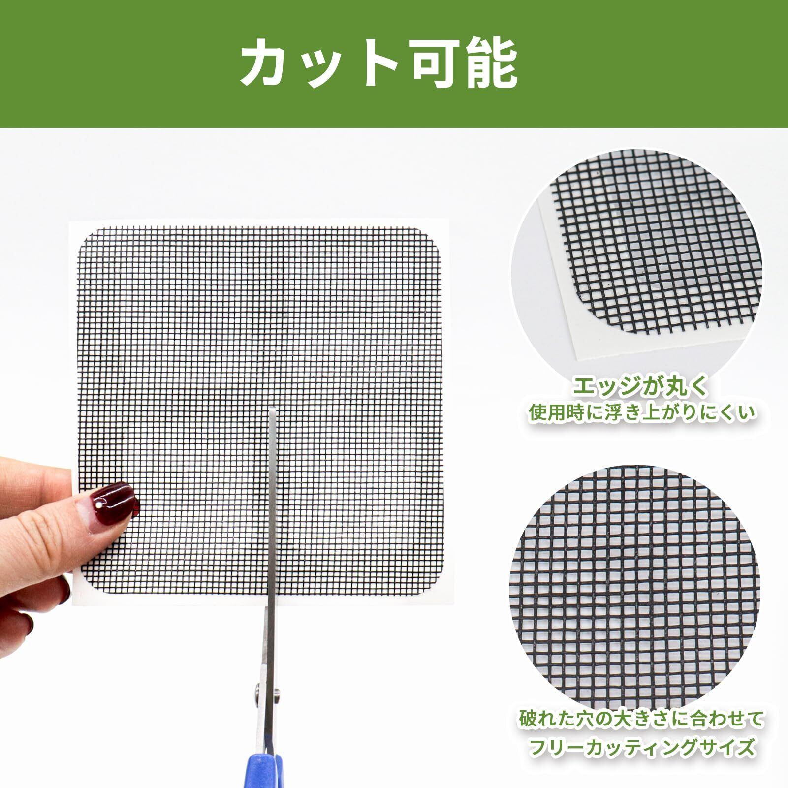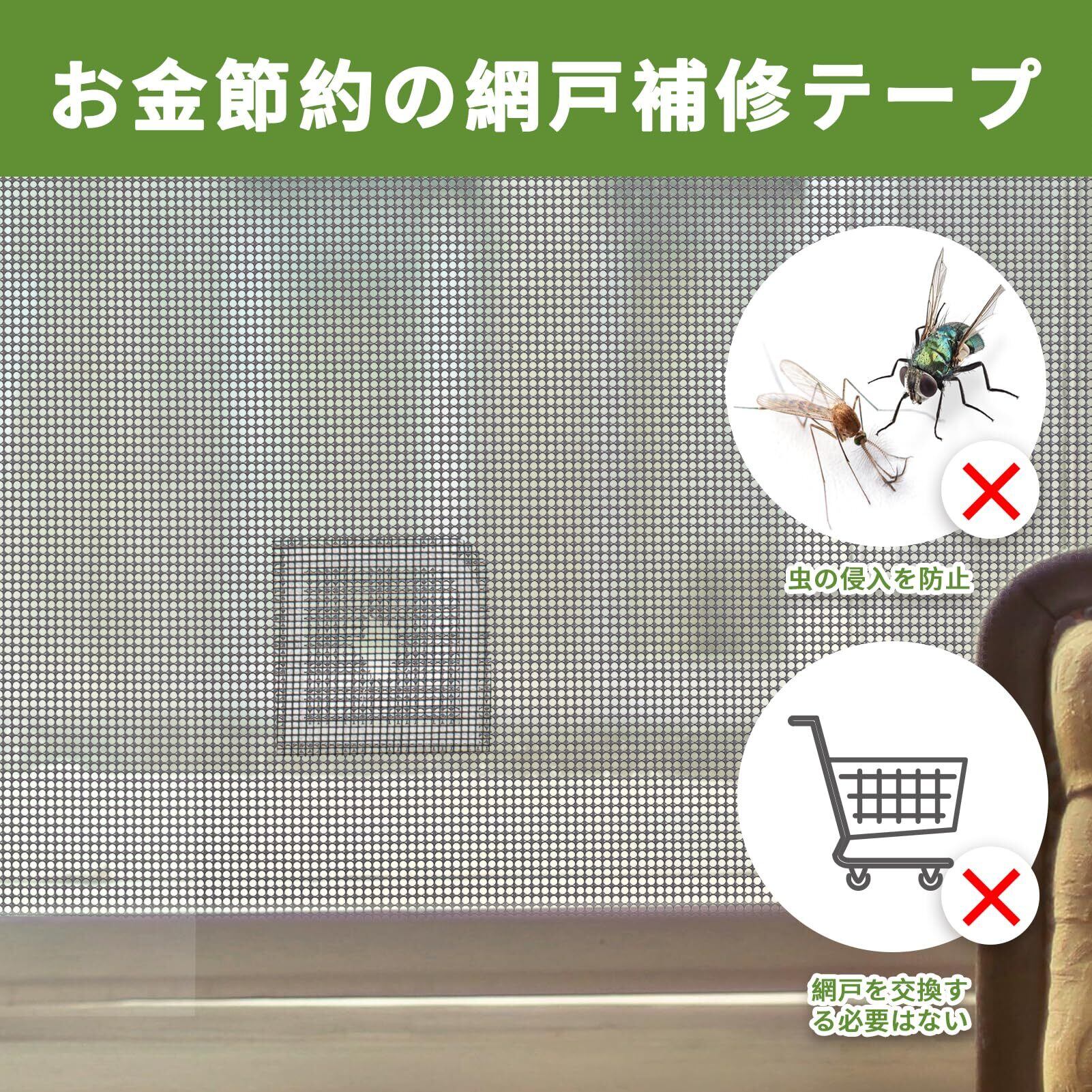 【用途広い】カーテン、網戸、屏風、蚊帳、テントネットなど、メッシュ製品が壊れているところに適しています。貼付け方法、まず、補修シートを貼る周り場所の汚れ及びホコリを綺麗に拭き取ります。次に、破れた部分をの網を鋏で綺麗に整えます。そして、穴のサイズに合わせて補修シートをカットします。最後に、破れた部分に網戸補修シートを貼り付けます。