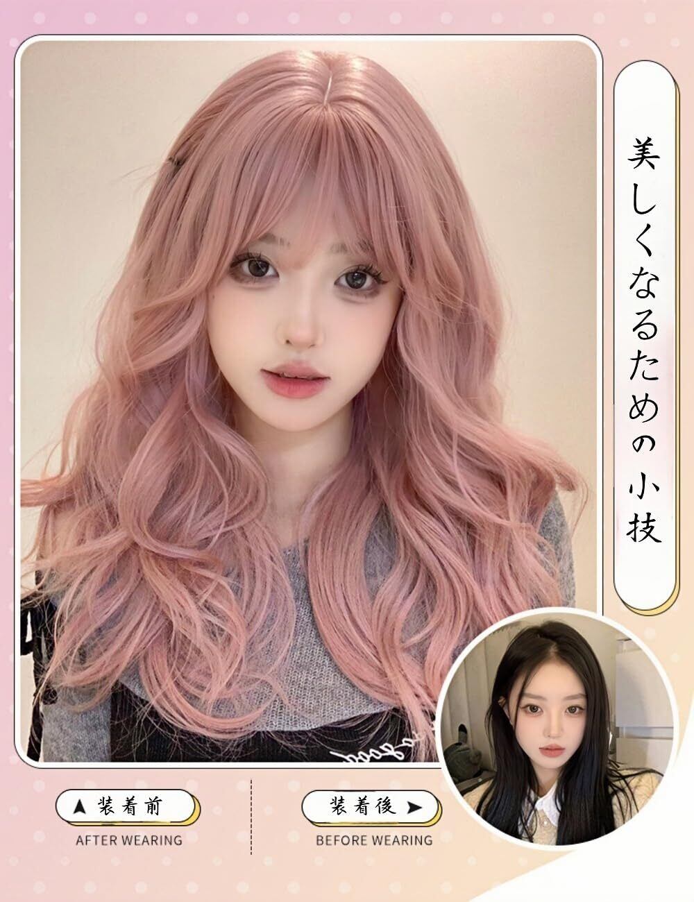 Sizuuenn 女性用 レディースフルウィッグ ロングヘア カール ぱっつん前髪 ピンク ウィッグ 「活力気泡粉」 クリスタルローズピンク 小顔 ファッション 耐熱ウィッグ 高温ヘア糸 コスプレかつら 専用ネット イベント 学園祭 文化祭 撮影用 変装用
