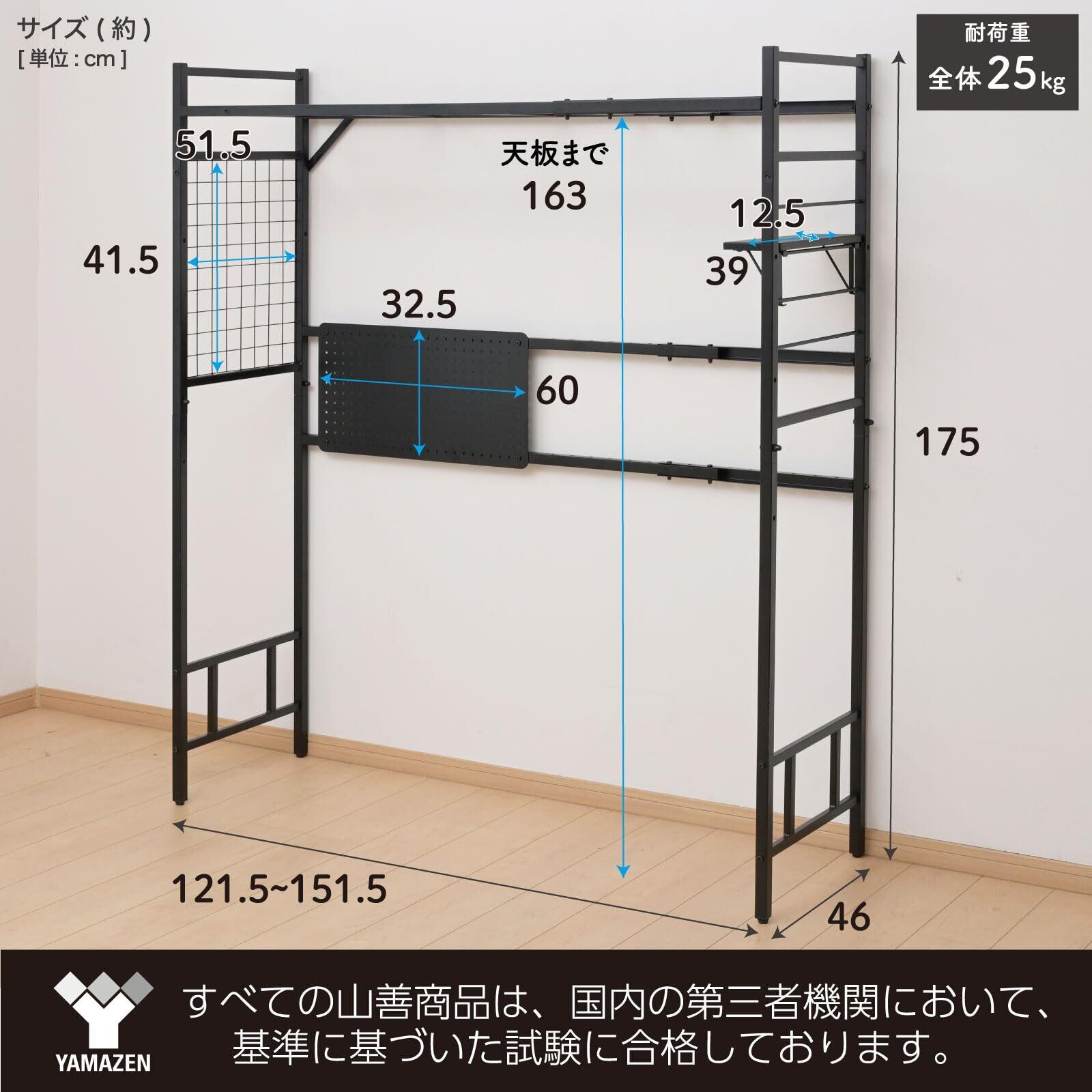 ●サイズ(約) : 幅121.5-151.5×奥行46×高さ175cm●耐荷重 : 全体25kg(メッシュ棚 : 1枚あたり5kg、ハンガーバー : 1本あたり2kg、有孔ボード : 1kg、サイドネット : 3kg、サイド棚 : 3kg)●構造部材 : 本体/金属(スチール)、天板/合成樹脂化粧繊維板(塩化ビニル樹脂)●表面加工 : エポキシ樹脂塗装●東証プライム(株)山善で扱うすべての山善商品は、自社もしくは第三者機関において、JIS規格に基づいた品質試験を行っております。