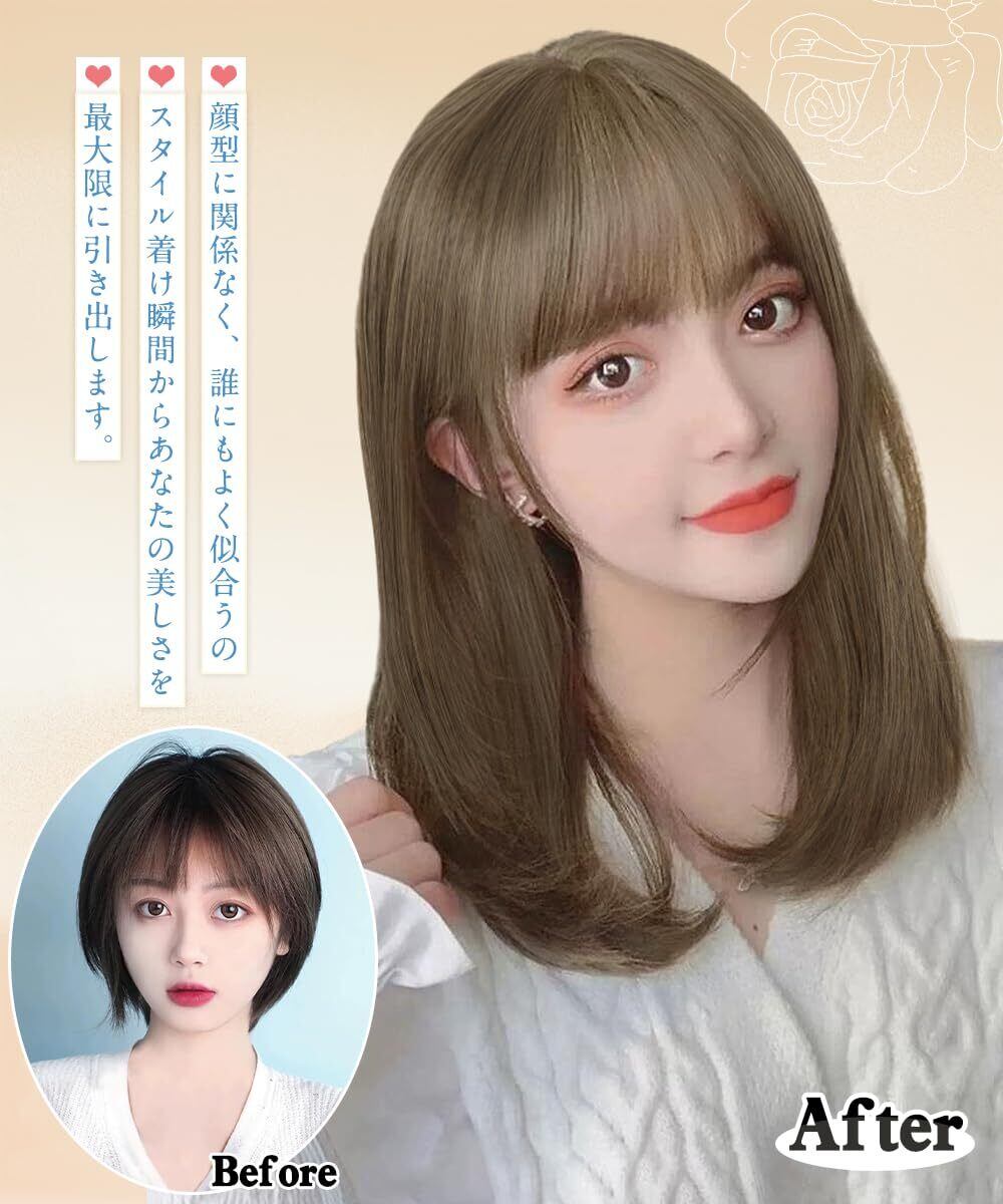 【小顔に見える髪型】小顔効果は抜群です。ふかし加工をして、前髪のふわふわ感を高めます。動きのある立体的な前髪がさらに可愛く見えます。髪型の曲がりもちょうどいいです。ぱつっと切りっぱなしのストレートでナチュラルなスタイル前髪も簡単に分けられます。綺麗さ優しい自然なゆるふわ髪を再現することができます。丸顔でも、面長でも、ベーシックな顔でも、このヘアスタイルはあなたに適しています。