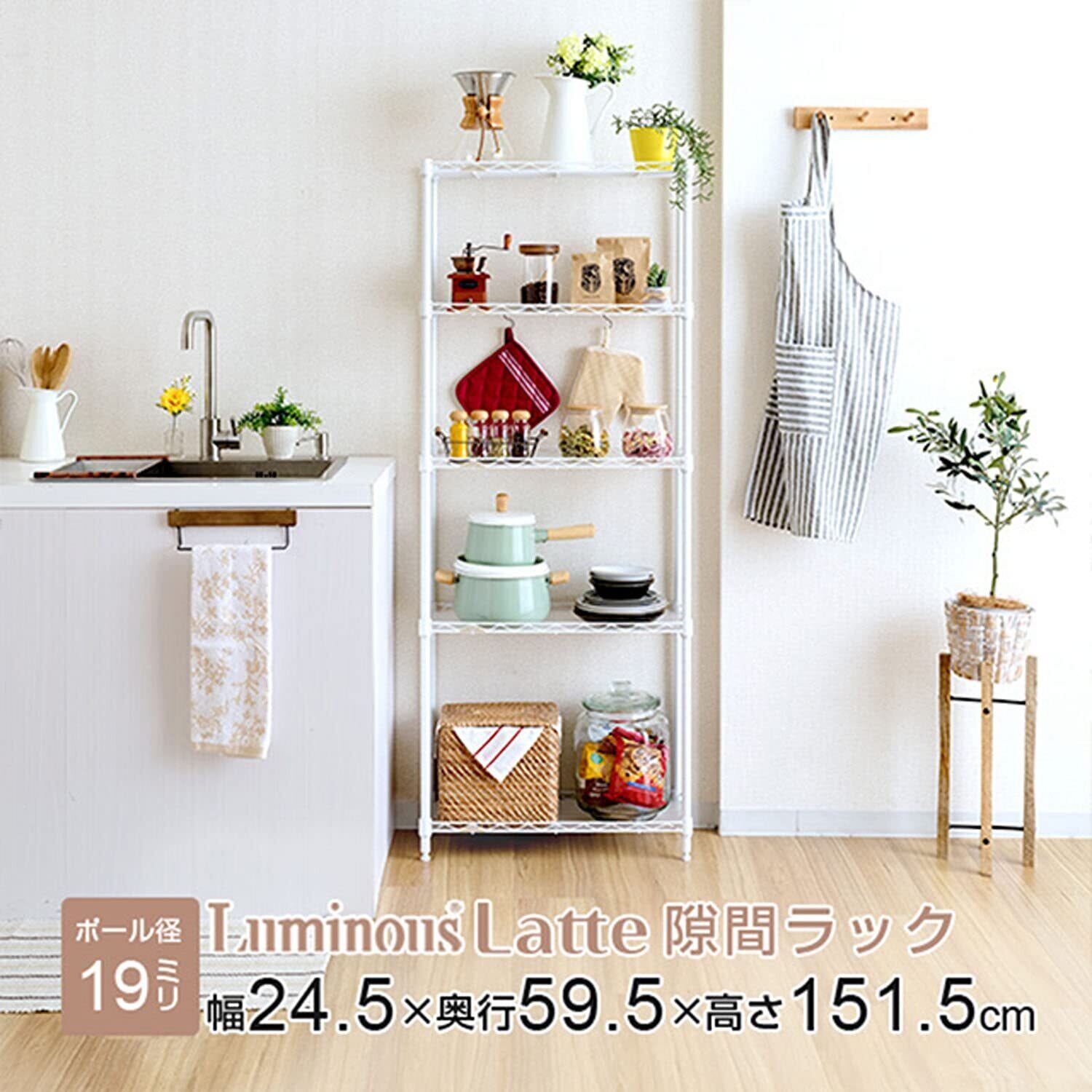 ドウシシャ ルミナス ラテ 隙間収納ラック 幅25cm 奥行60 5段 ホワイト 白 おしゃれで可愛い スリムスチールラック 落下防止シート付き 全体耐荷重150kg 幅24.5×奥行59.5×高さ151.5cm キッチン収納 ポール径19mm LL2560-5WH