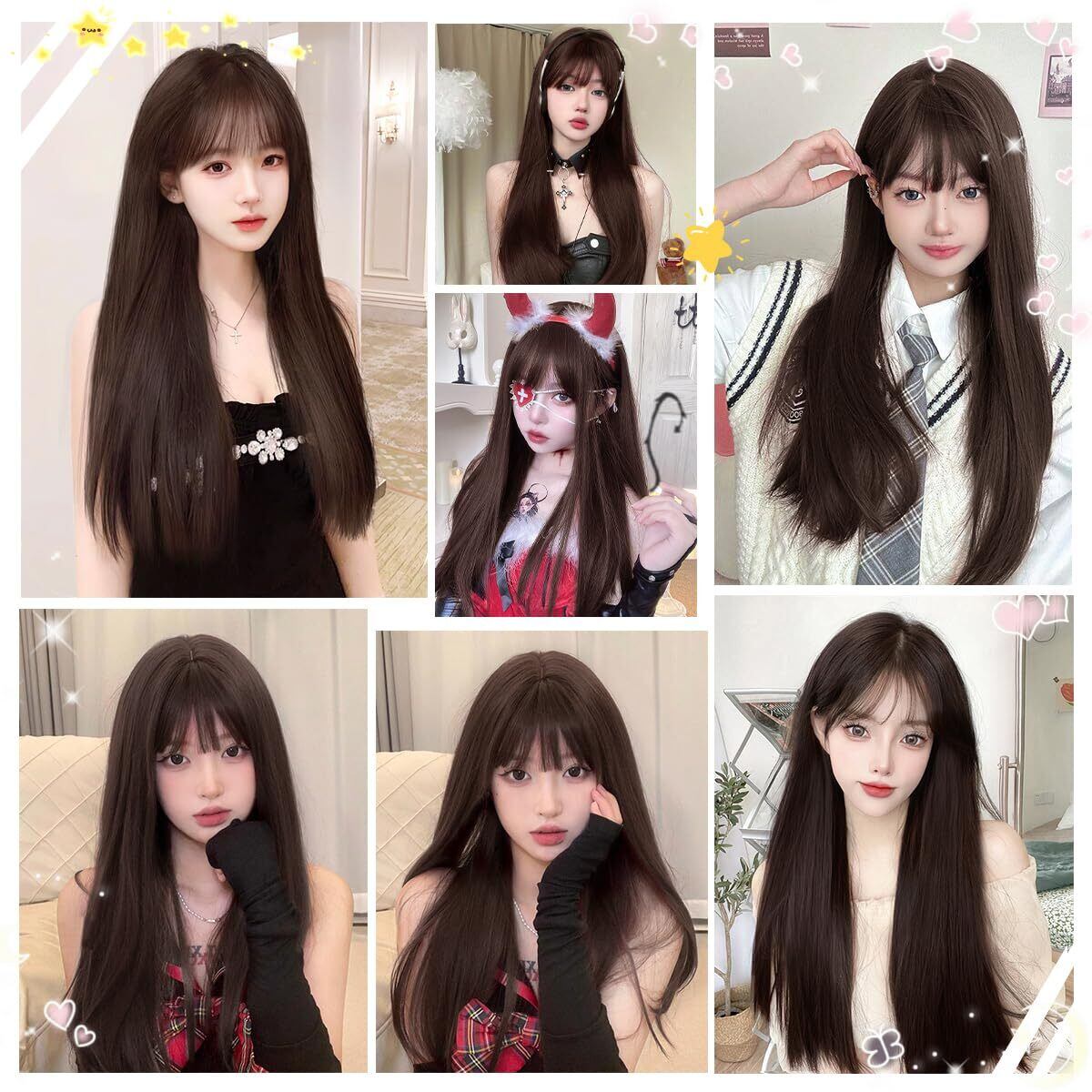 knnzkウィッグ ロング ストレート フルウィッグ 女性 ロリータ コスプレ 日常使い 自然 地雷女 韓国風 女装ウィッグ 耐熱ファイバー ブラウン(60cm)