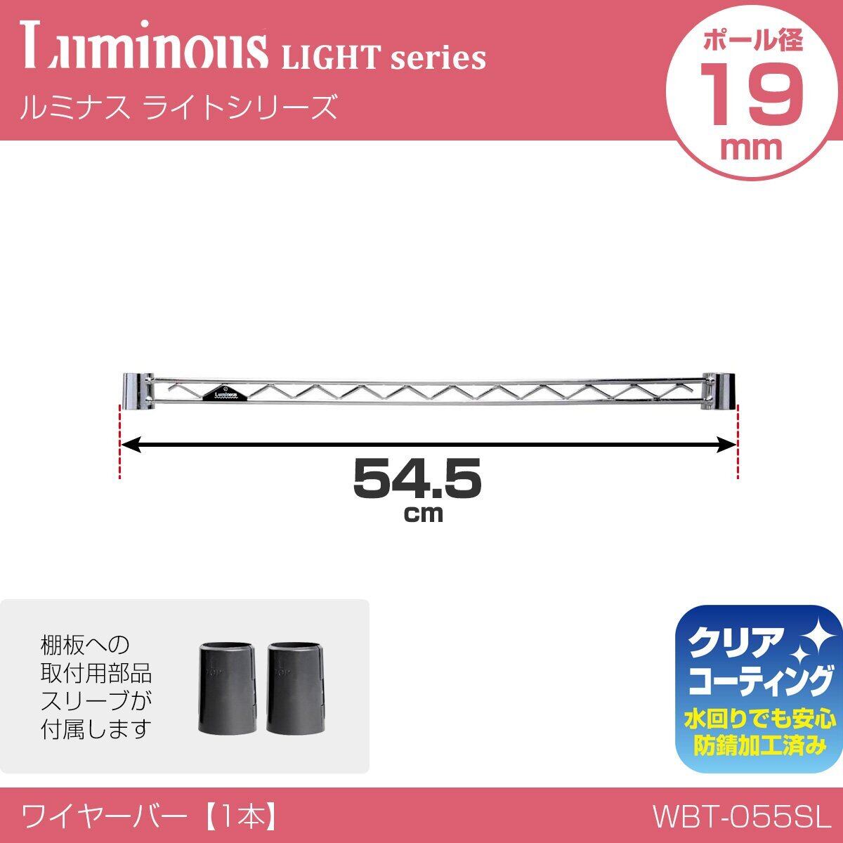 ドウシシャ ルミナス ラック スチールラックパーツ 補強バー ワイヤーバー 幅54.5cm WBT-055SL スリーブ2個付き 脚グラつき防止 落下防止柵 物掛けフレーム フック 追加 業務用 頑丈 DIY 奥行55cmモデル ポール径19mm