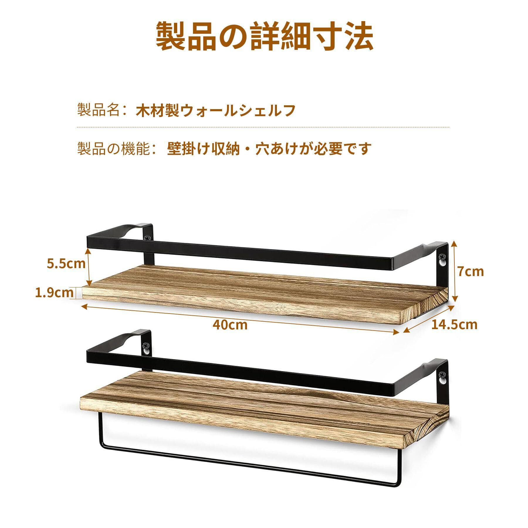 ウォールシェルフ 壁掛け棚 2個セット タオルバー付き 天然木製 玄関 キッチン 洗面所 トイレ 寝室 DIY 取り付け簡単 (淡い色)