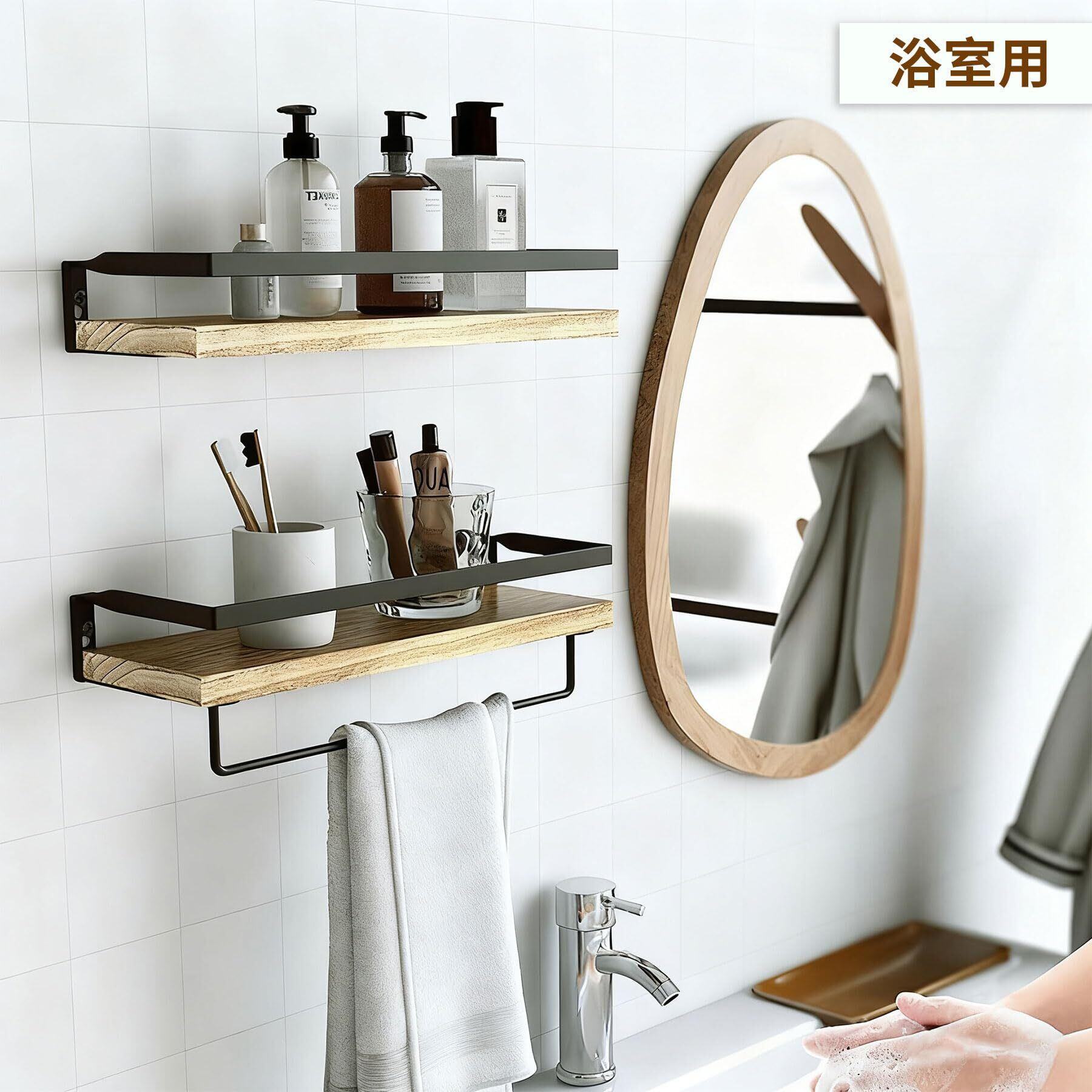 【バスルーム用 鉄製木製壁掛けラック】木製天板にブラック鉄製フレームを組み合わせ、自然な質感とインダストリアルスタイルが融合。見た目も機能も両立する収納アイテムです。
