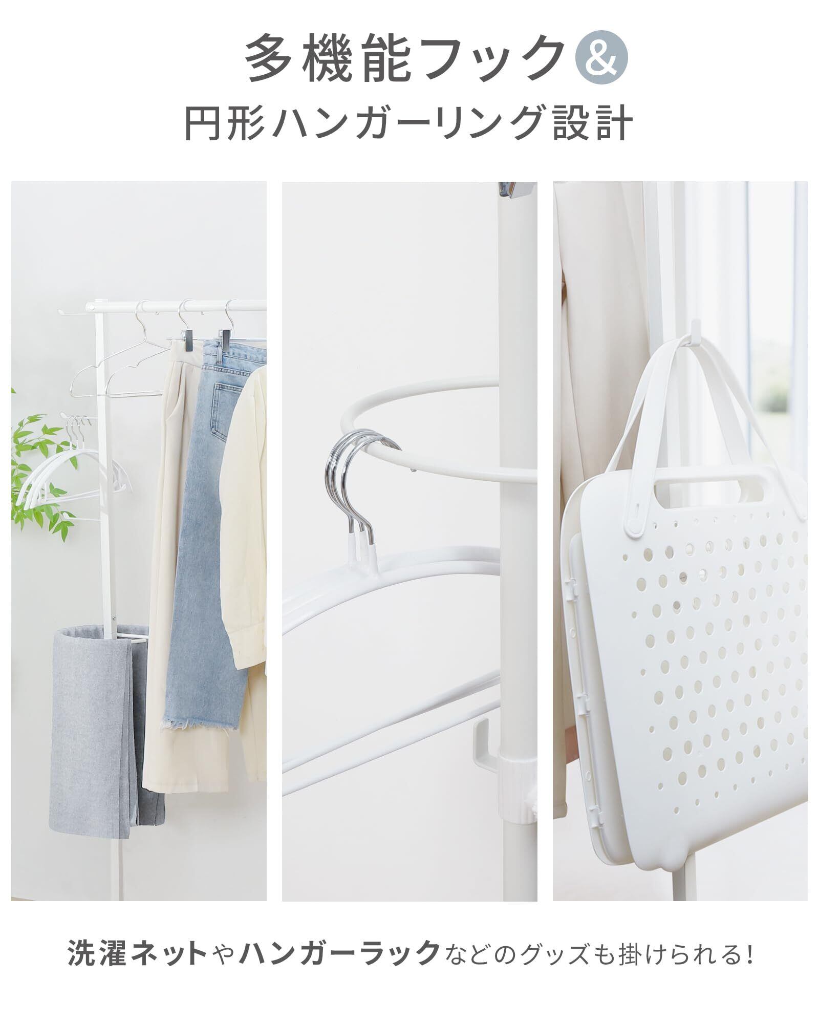 【多機能フック&ワンタッチ折りたたみ】 円形ハンガーリングと多機能フックにより、ハンガーや洗濯ネットなどを効率よく掛けられます。