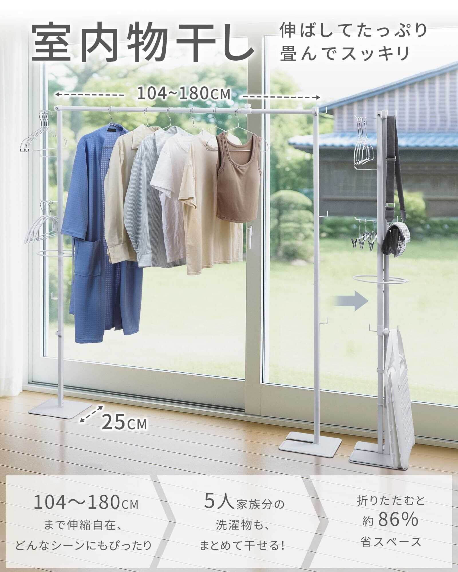 【104〜180cm自由伸縮・空間に合わせて調整】 横幅は104〜180cmまで無段階で伸縮可能。ベランダ、室内、洗面所など設置場所に応じて柔軟に調整できます。布団やシーツなどの長物にも対応し、日常の洗濯から大量干しまで幅広く活躍します。
