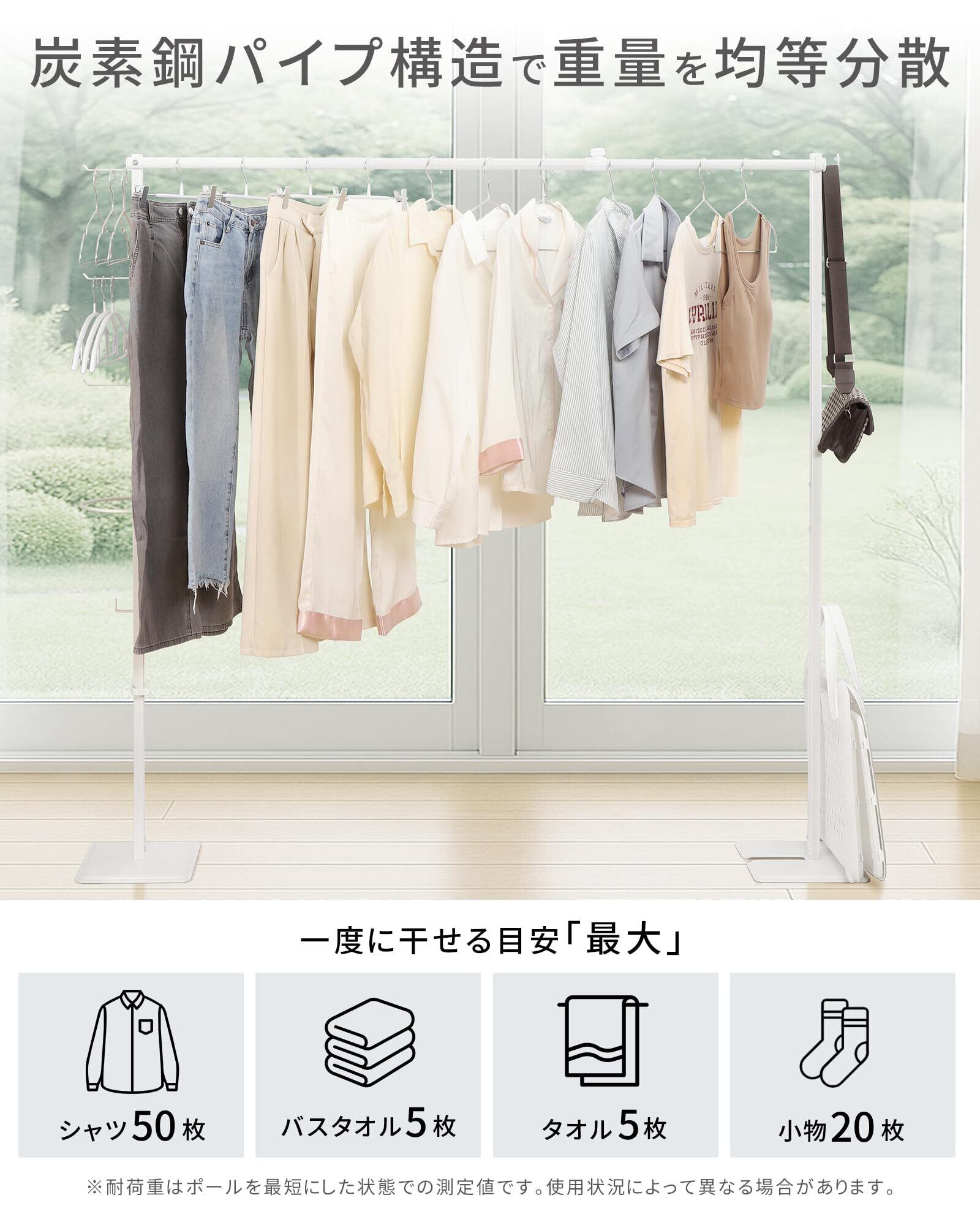 【耐荷重50kg・炭素鋼フレームで安心】 丈夫な炭素鋼パイプ構造により、最大耐荷重50kgを実現。 厚手のコートや布団も同時に干せるため、洗濯量の多いご家庭でも安心です。 ※耐荷重はポール最短時の測定値です。