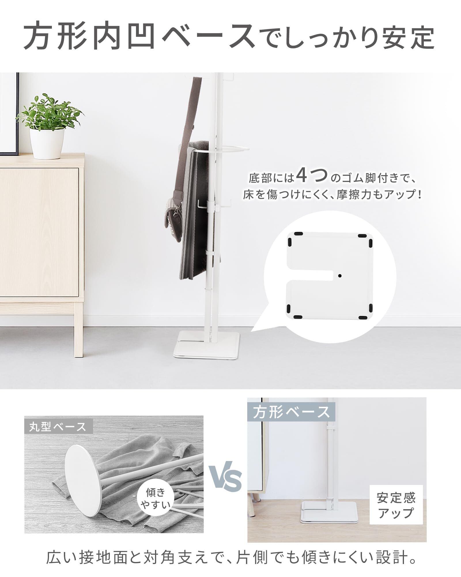 【横倒し防止設計・倒れにくい安定ベース】 側面フックに衣類を掛けてもバランスを崩しにくく、方形の内凹ベースが重心をしっかり安定させます。洗濯物を多く掛けた状態でも倒れにくく、使用中も安心してお使いいただけます。 さらに、底部には4つの滑り止めゴム脚を備え、安定性を高めると同時に、転倒による壁面への接触や床へのキズを防止します。
