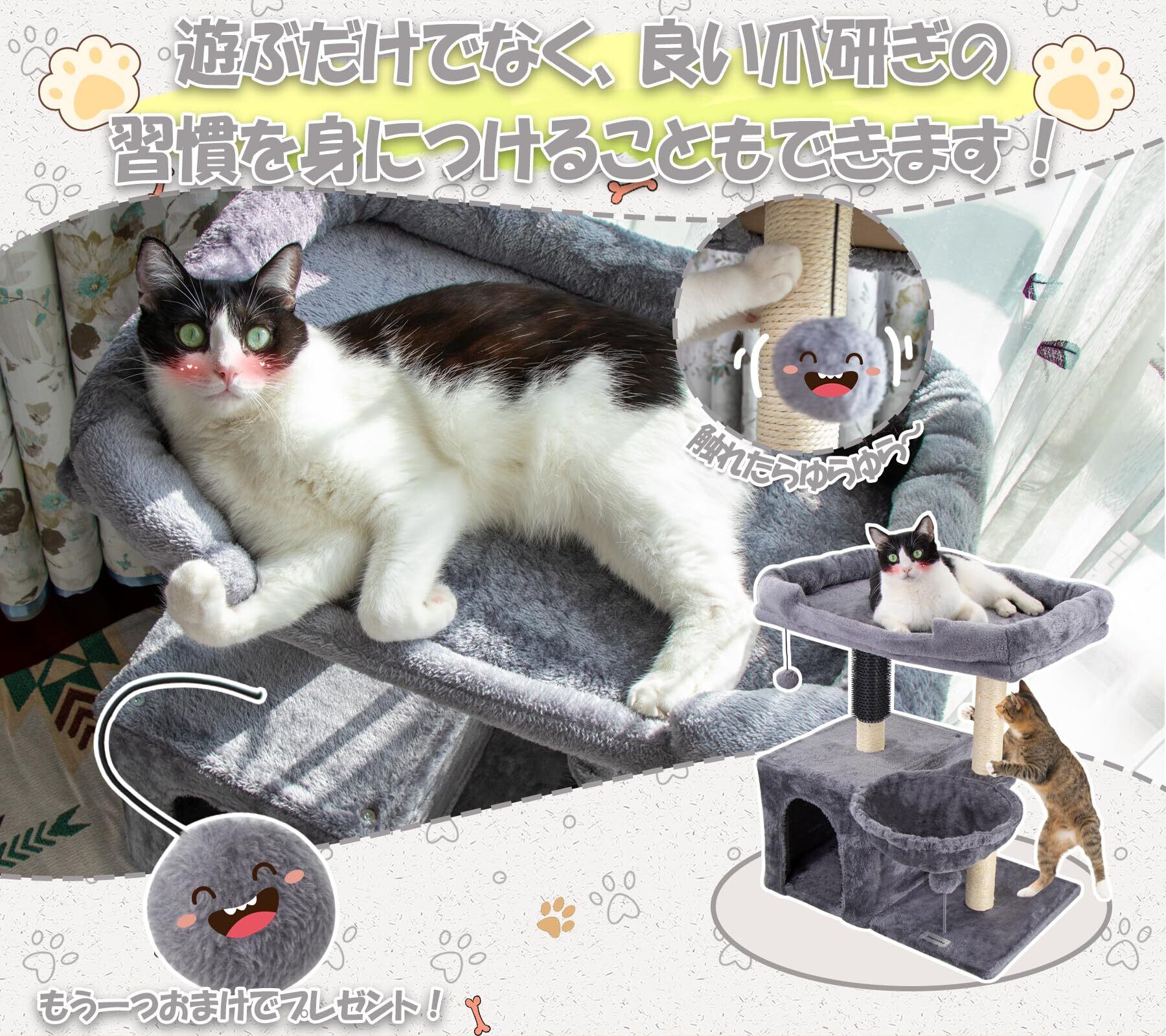 【多機能キャットタワー】猫の日常を快適に過ごさせるため、見おろし展望台、サイザル麻コラム、セルフグルーマー、ハンモック、ダングリングボール、居心地の良いベッドが一つに。コンパクトで場所をとらず、猫用の寝床、爪とぎ、ミニキャットツリー、子猫にも最適。