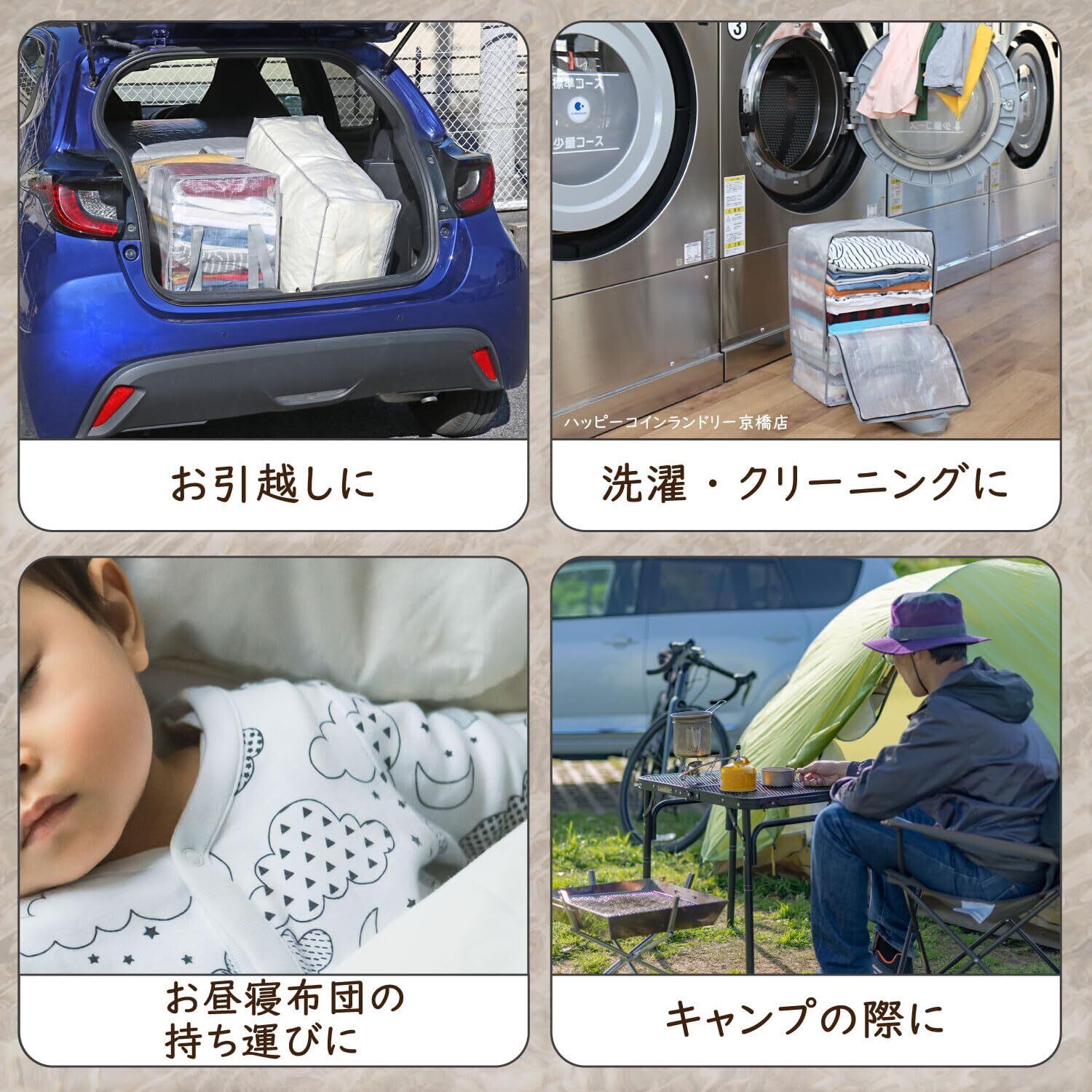 【持ち運びやすい収納バッグ】:クローゼットへの収納や持ち運びに使えるバッグ型の衣類収納ケース。オフシーズンの衣類などをホコリや汚れなどから守りスッキリと収納。