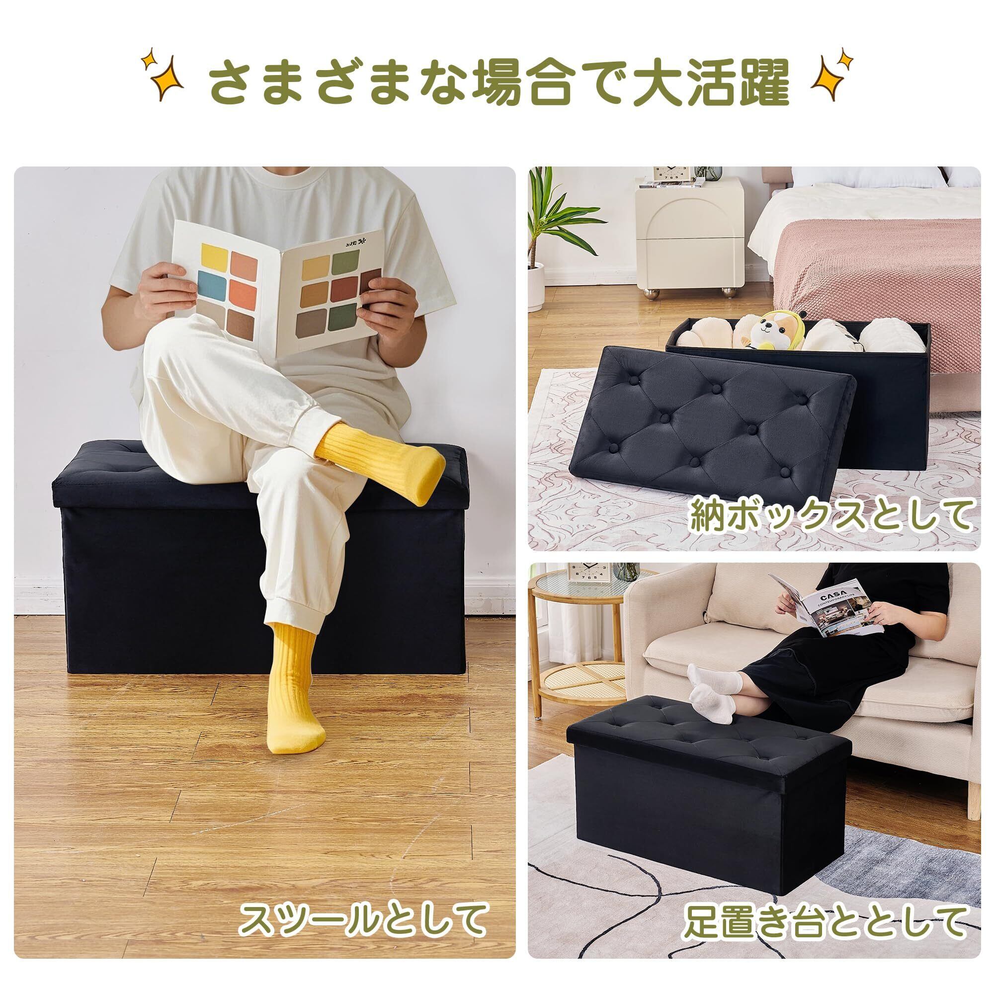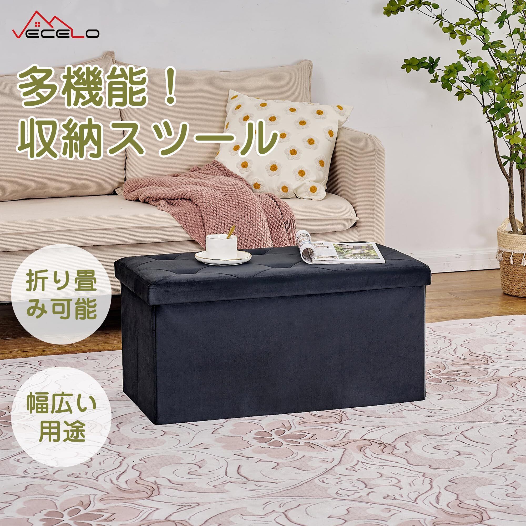 VECELO 収納スツール オットマン 収納ベンチ 収納ボックス 幅76*奥行き38*高さ38CM 耐荷重120kg 多機能 折り畳み可能 踏み台 足置き リビング/玄関/寝室適用 おもちゃ箱 洋服収納 化粧品収納ボックス ブラック
