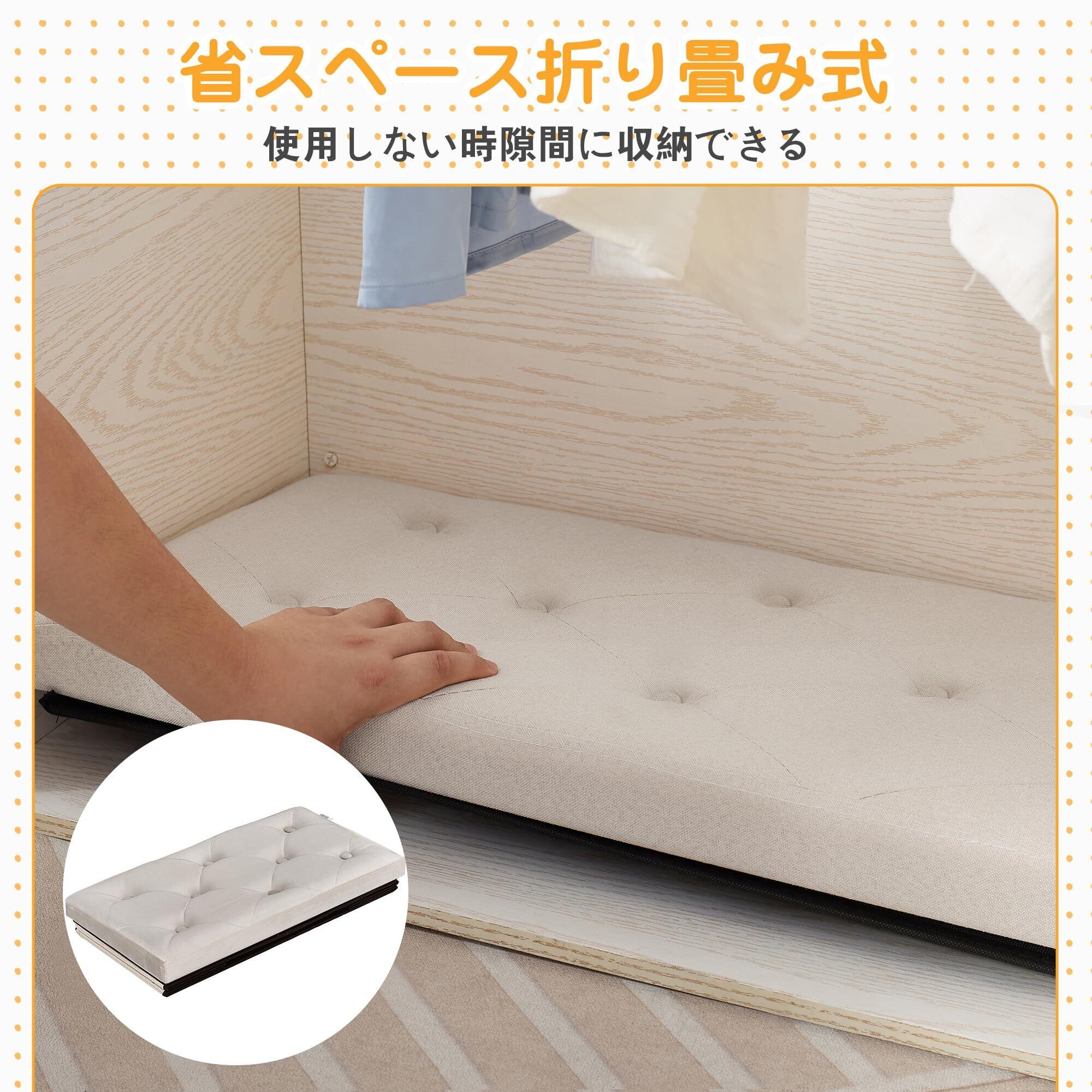 【折りたたみと組立簡単】この収納スツールは説明書が要らず、折りたたんだ部分を広げるだけですぐに使用できます。使用可能までには数秒しかかかりません。使用していない時、折りたたんで隙間に置き、スペースを取りません。