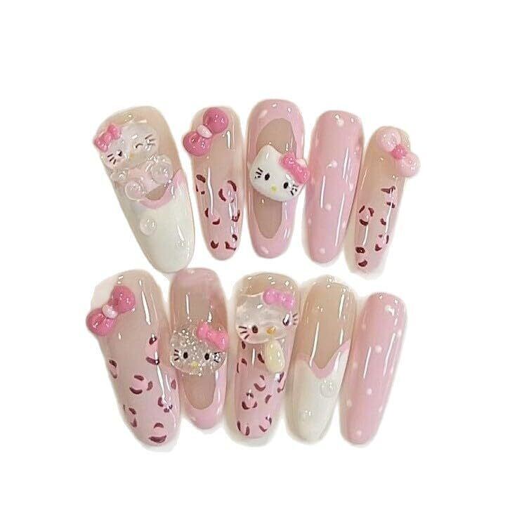 デザイン性: キティKitty をモチーフにした可愛らしい立体デザインで、ラインストーンの装飾が施された華やかなネイルチップです