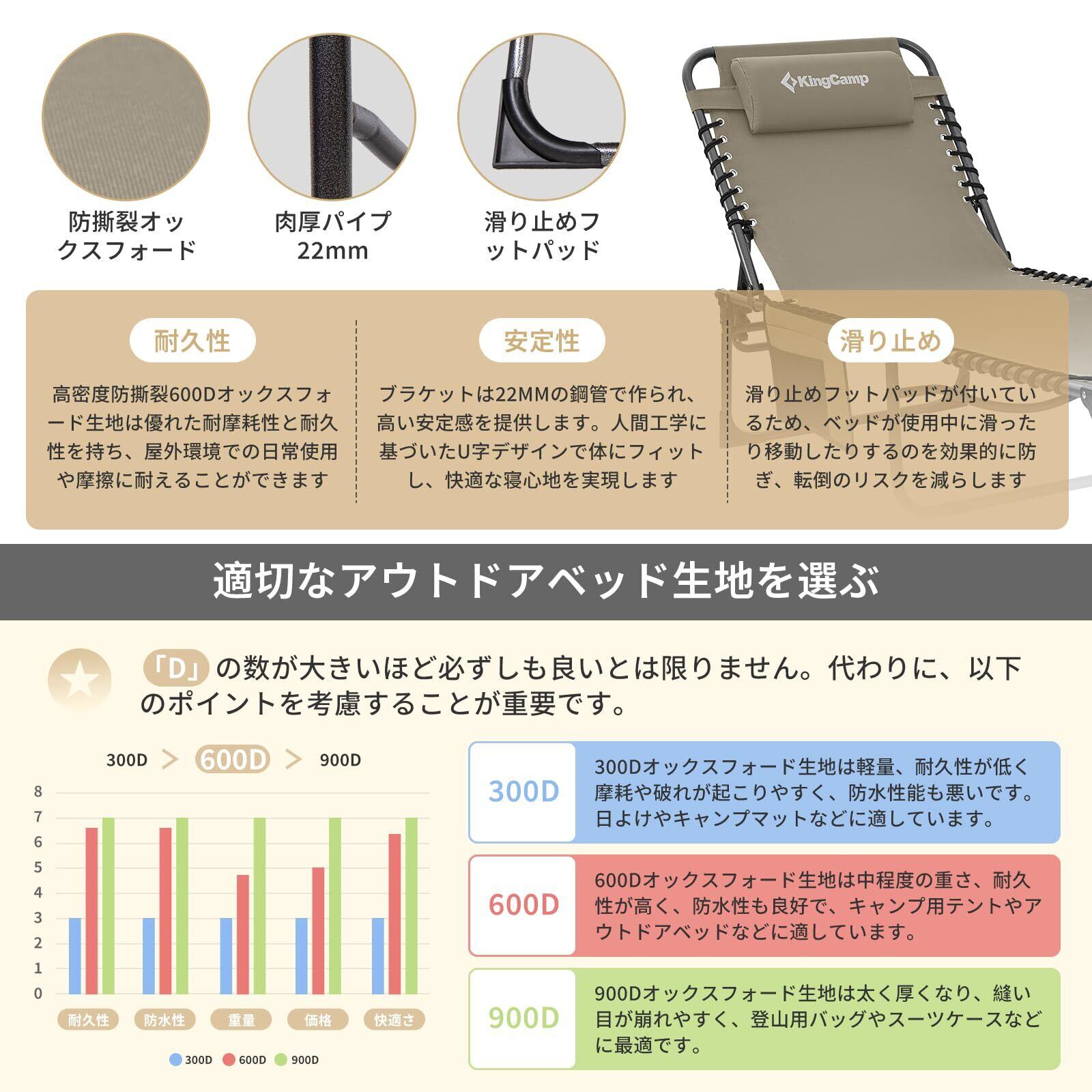 【耐久性と安定性】高密度防撕裂オックスフォード生地を使用し、耐久性が高く、長時間の使用にも耐えます。ベッドフレームは強固なスチールで作られ、高い安定感を提供します。人間工学に基づいたS字デザインで体にフィットし、快適な寝心地を実現します。さらに、防滑フットカバーが付いており、野外でも揺れることなく、快適かつ安定した休息を楽しむことができます。