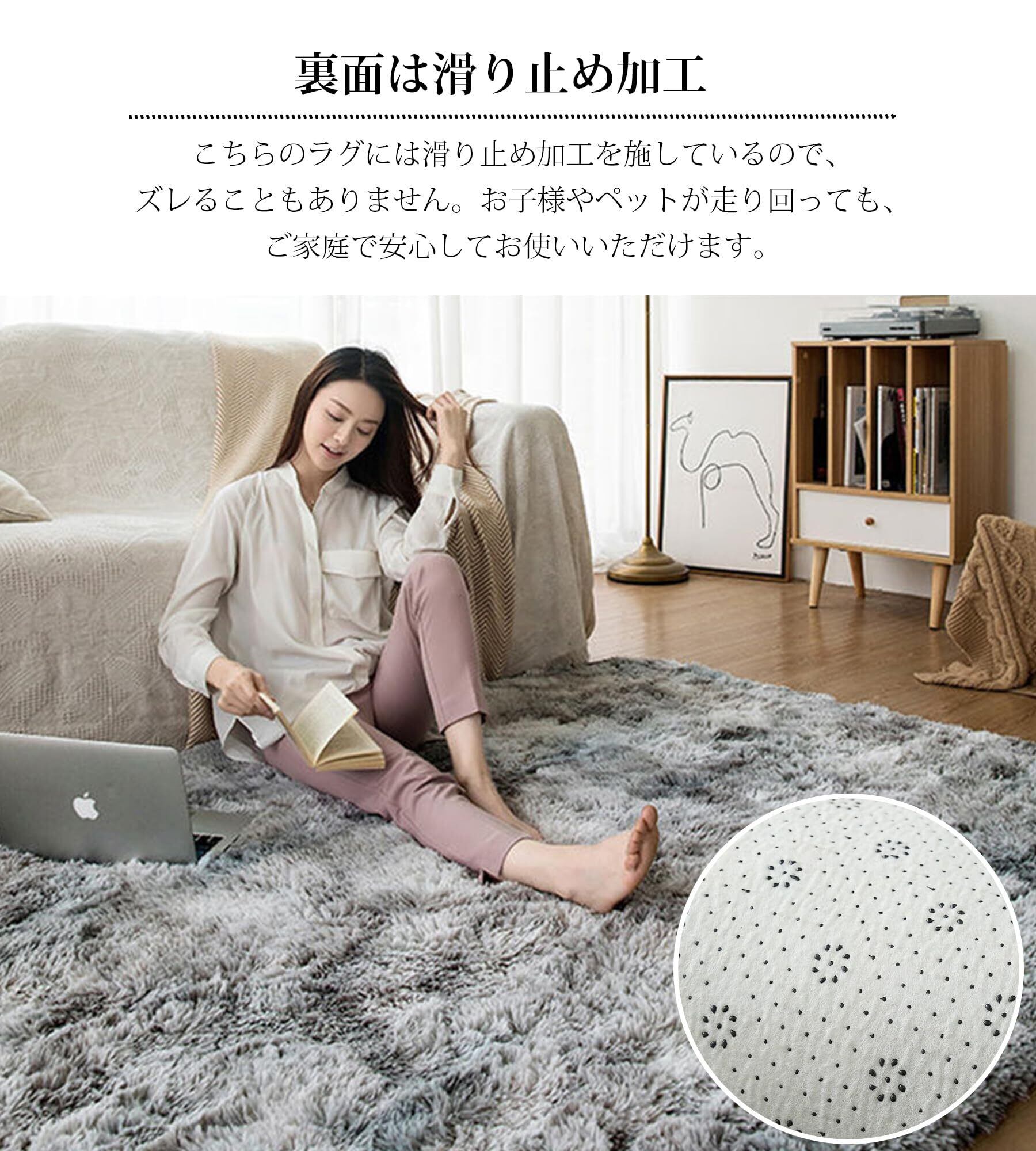 【裏面は滑り止め加工】こちらのラグには滑り止め加工を施しているので、ズレることもありません。お子様やペットが走り回っても、ご家庭で安心してお使いいただけます。また、裏面は不織布で床を傷つけません。