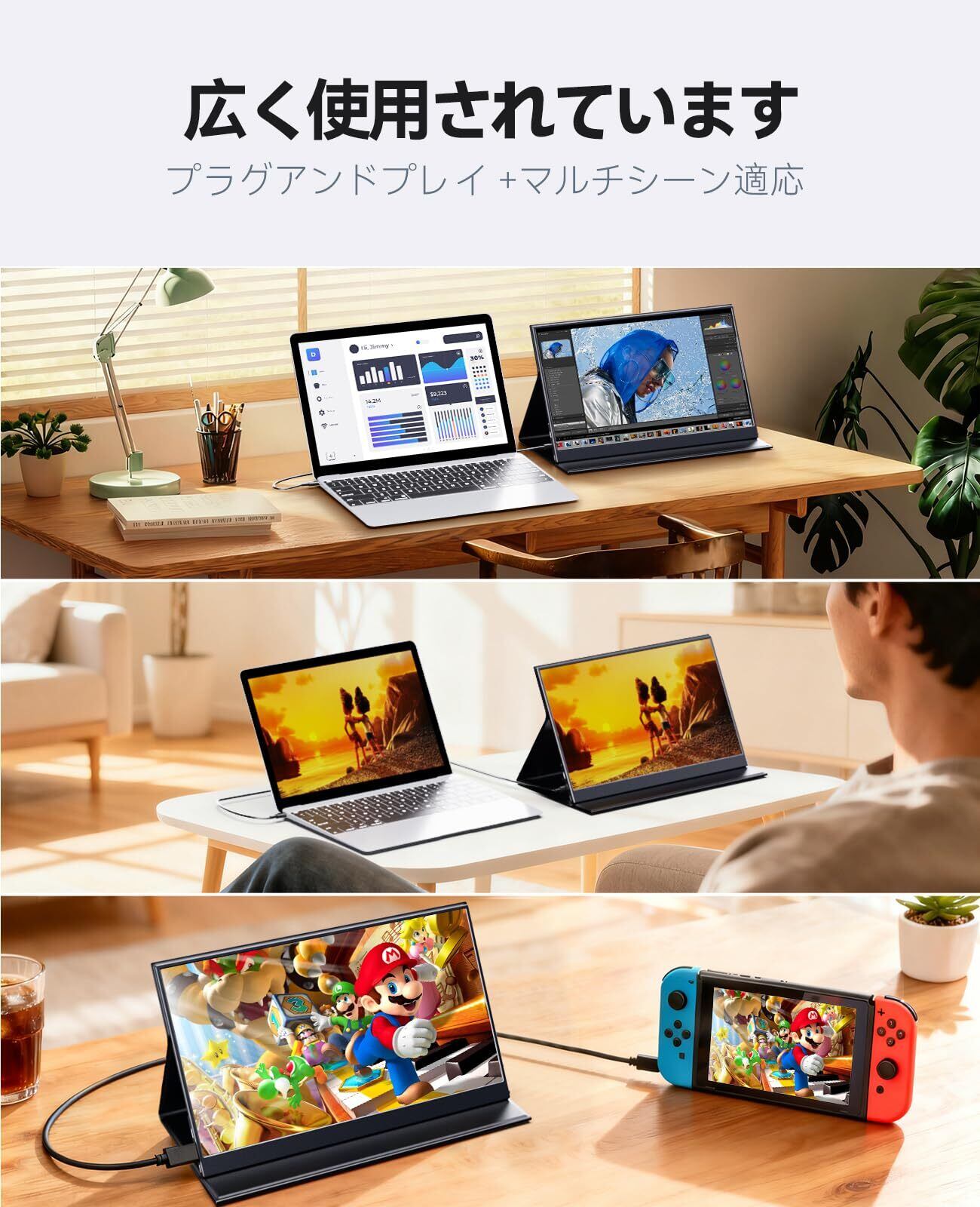 【10点タッチモニター】このポータブルモニターは、10点タッチ機能を備えた高品質の超薄型タッチスクリーンを採用しています。より強力なセンサー性能とデータ処理能力により、複数の指を正確、敏感、スムーズに動かすことができます。注釈の描画、プロフェッショナルなシナリオでのマルチタスクのコラボレーション、エンターテイメントでの複数の指で操作するゲーム、会議でのインタラクティブなコラボレーションなど、スムーズに応答して、より高感度で直観的なタッチ体験をもたらし、仕事、勉強、レジャー、エンターテイメントにオールラウンドなアップグレードをもたらします。