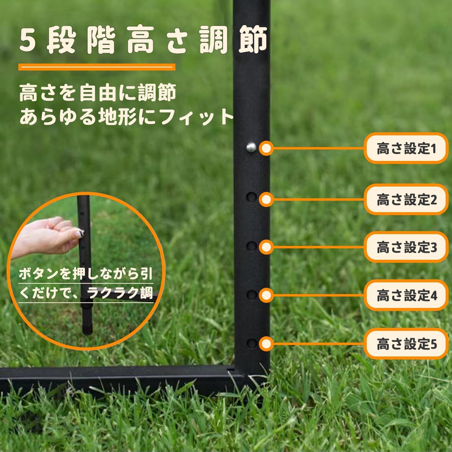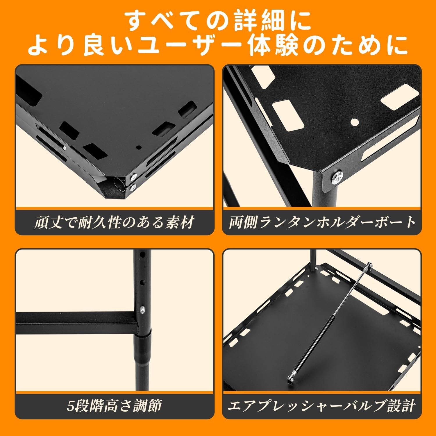 3. 5段階高さ調節 5段階の高さ調節システムにより、アウトドアの不整地や様々な使用シーンに柔軟に対応。高さは48cmから60cmの間で調節可能で、調理、食事、作業、キャンプギアの整理など、多様な用途に最適です。