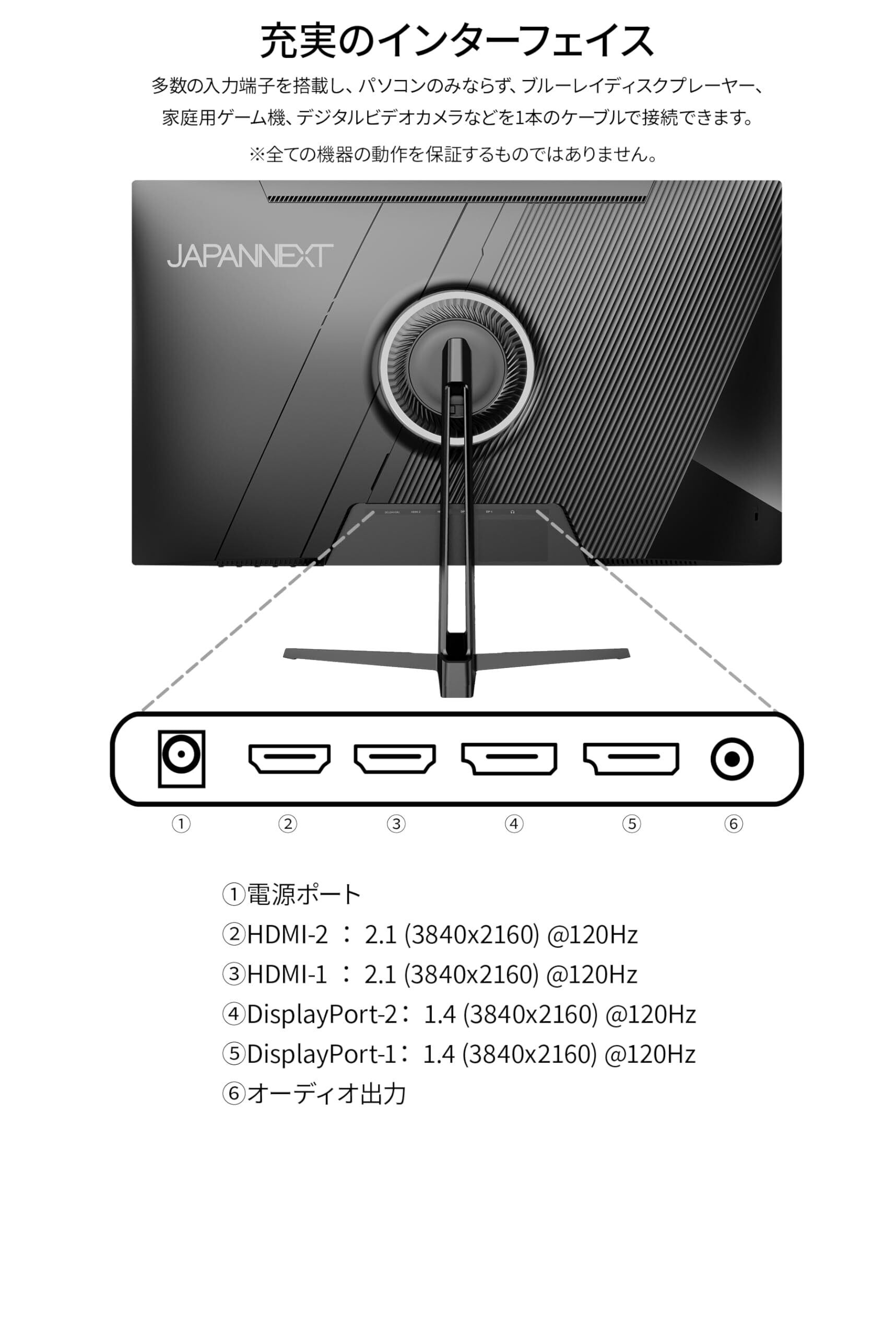入力端子はHDMI 2.1 x2 (120Hz)とDisplayPort 1.4 x2 (120Hz)を装備し、様々な機器との接続が可能です。
