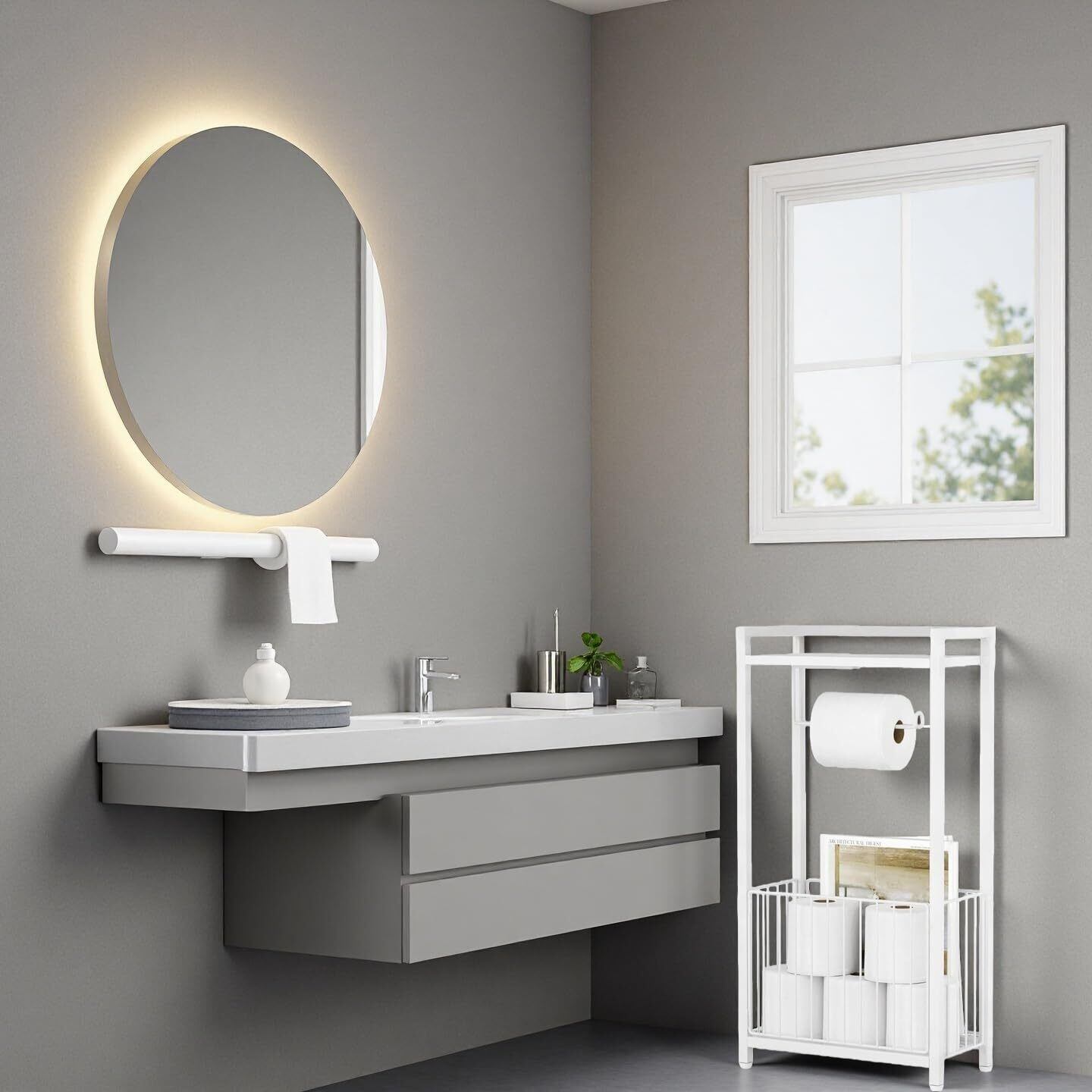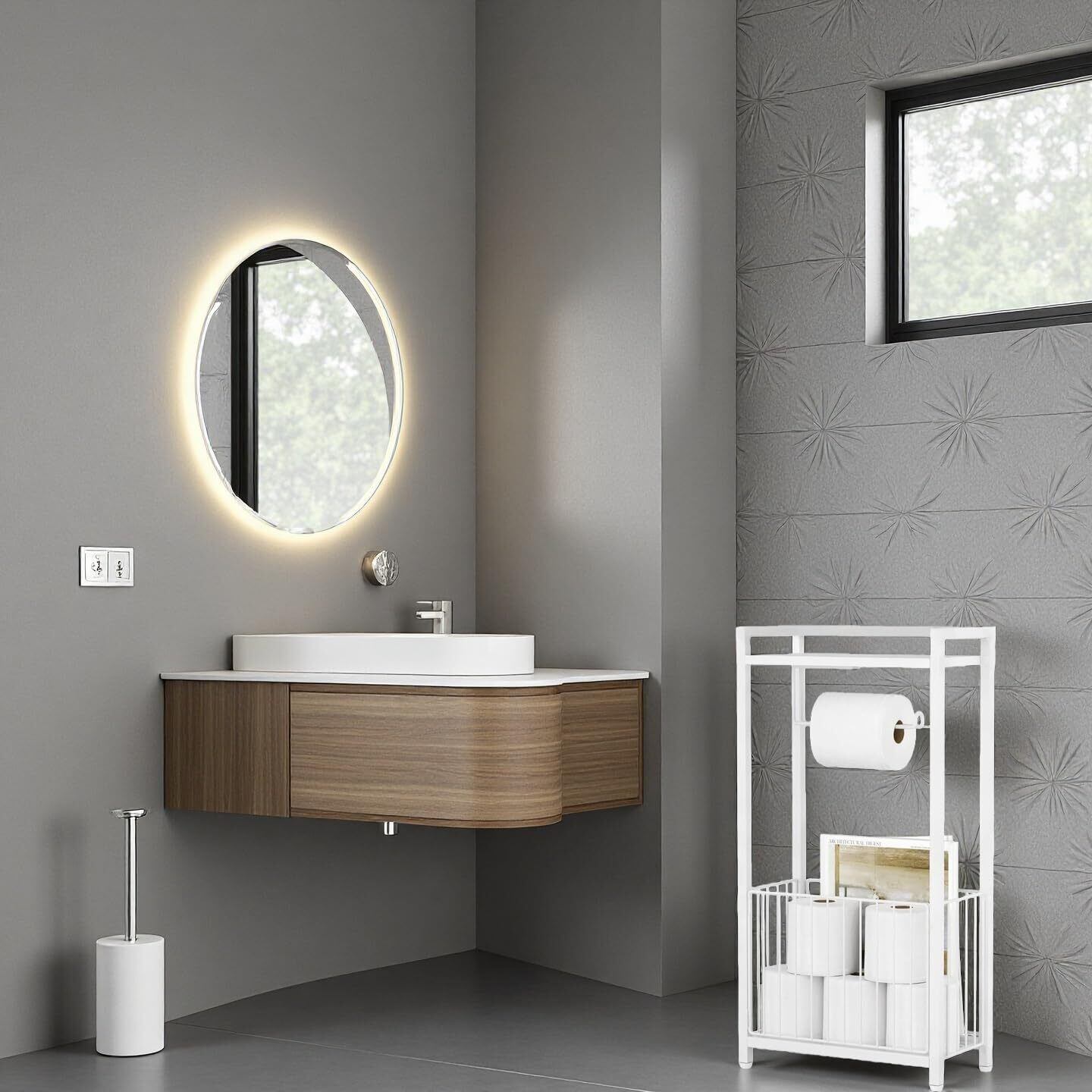 このオーガナイザーは、最大 6 ロールのトイレット ペーパーを保管し、1 ロールは常に手元に置いておきます。上の棚は、携帯電話、ウェットティッシュ、さらには香りのキャンドルや小さな植物を置くのに最適で、空間に新鮮さをもたらします。下部のワイヤーバスケットは本や雑誌を入れるのに最適で、居心地の良い小さな読書コーナーを作ります。