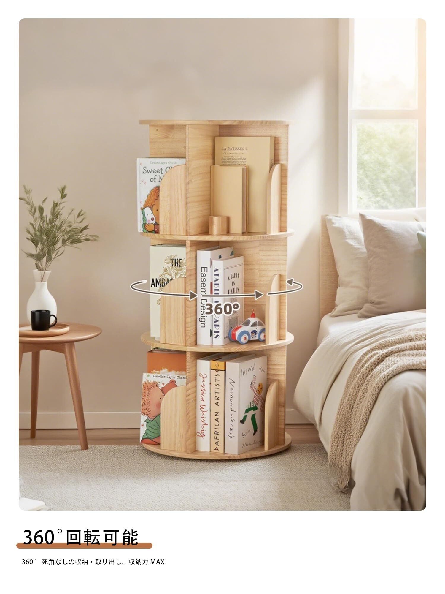 本棚 回転式本棚 大容量 絵本棚 天然木 3段 直径40cm ブックシェルフ 子供 絵本ラック 漫画棚 収納棚 CDラック DVDラック 天板に物が置ける 組立簡単 日本語説明書付