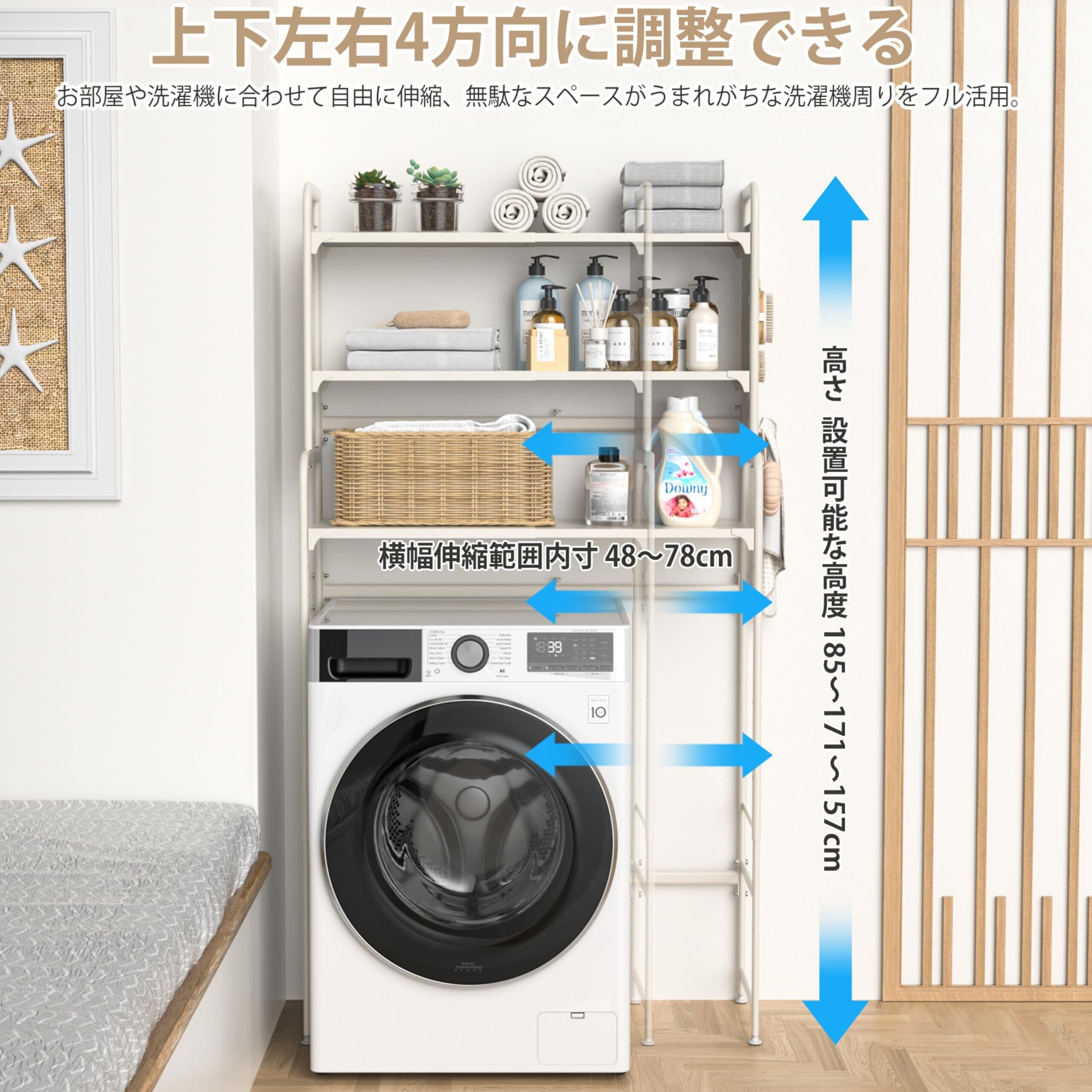 洗濯機ラック ランドリー収納棚 有孔ボード付きランドリーラック 棚3段 幅伸縮タイプ(51~81cm) 3段階に高さ調節可能 フック付き 洗濯機上収納 (ホワイト)