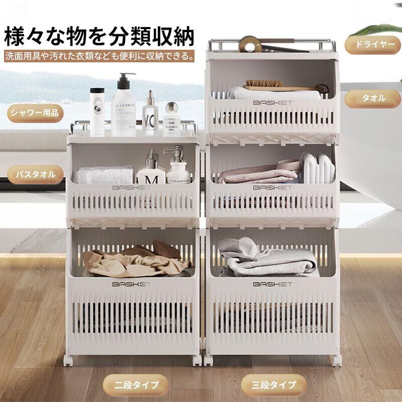 【省スペース】スリム設計の収納は、限られた洗面所やランドリースペースにぴったりです。隙間に収まる縦置きの3段タイプで、収納力を最大限に活用できます。清潔で整頓された家庭環境を実現し、毎日の着替えやバス用品(シャワージェルやボディローションなど)の整理に役立ちます。限られたスペースでも効率的に収納が可能です。