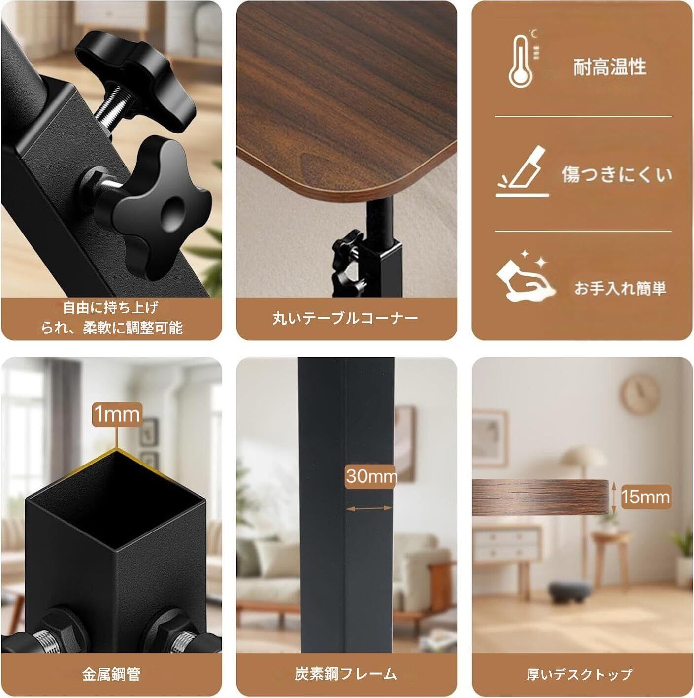 【2026全新改良版 高品質サイドテーブル】のベッドテーブル、お客様の声を集めてを改善!スチールフレームと板の厚さを強化し、ベッドサイドテーブルはより安定し、より大きな重量に耐えられるようになりました、揺れたり変形したりしにくい、長持ちします、さらに、水や汚れに強いメラミン化粧板を使用し、汚れがついてもサッと拭くだけで簡単に手入れができます