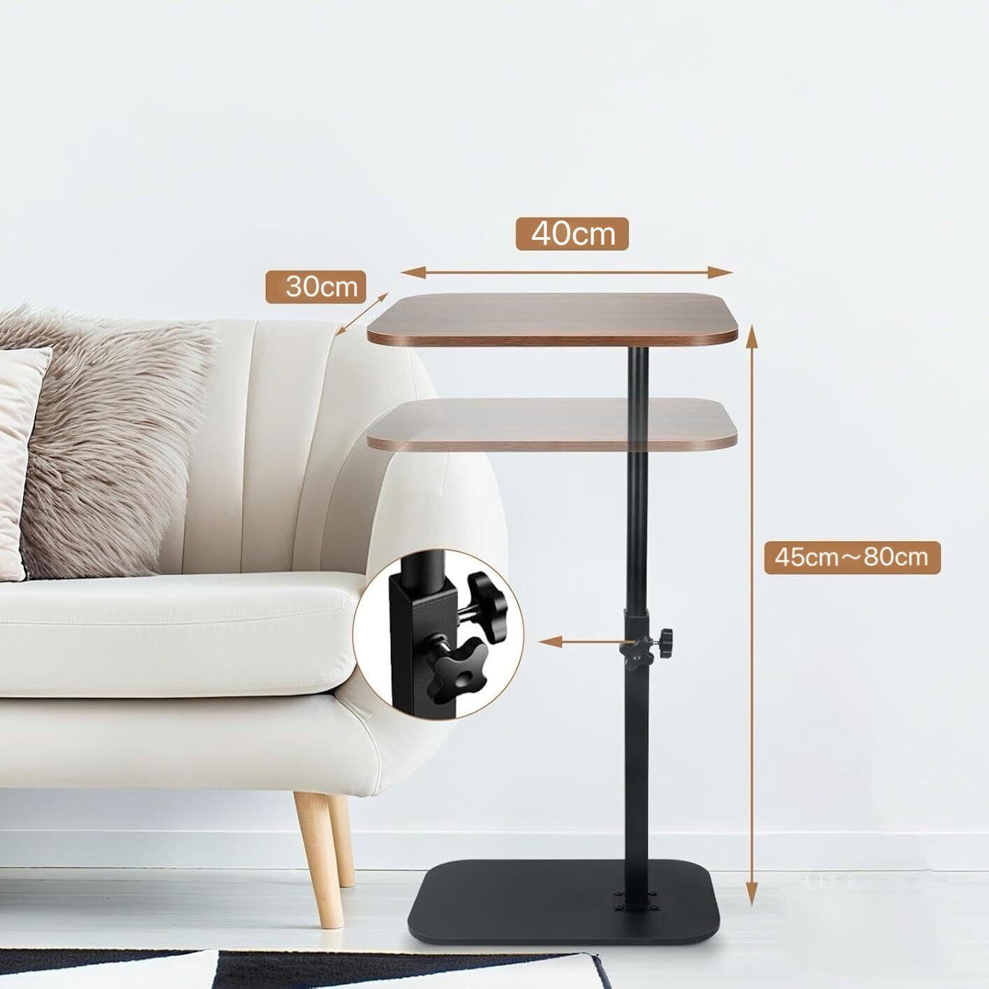 【高さ調節可能 ・360°回転】スチールフレームリフティングロッドを採用し、45-80cmの範囲で高さは自由に調節できます。ソファやベッドなどの高さに応じてが設置できます。調節回転を回すだけなので、いつでも簡単に調整が可能。用途に応じて立ち作業と座り作業をスムーズに切り替えられます。デスクトップは360度回転できます。お好みの方向に自由に調整できます。