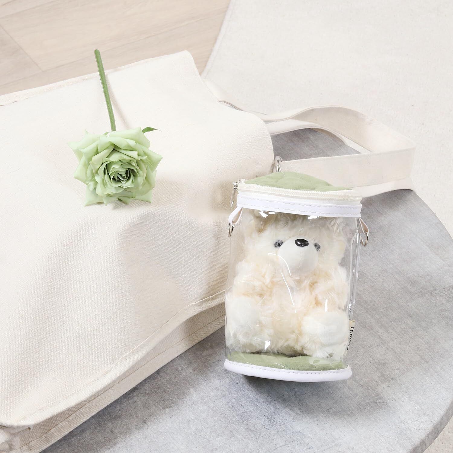 推しと一緒にお出かけできるショルダー掛け可能なぬいぐるみクリアバッグです。