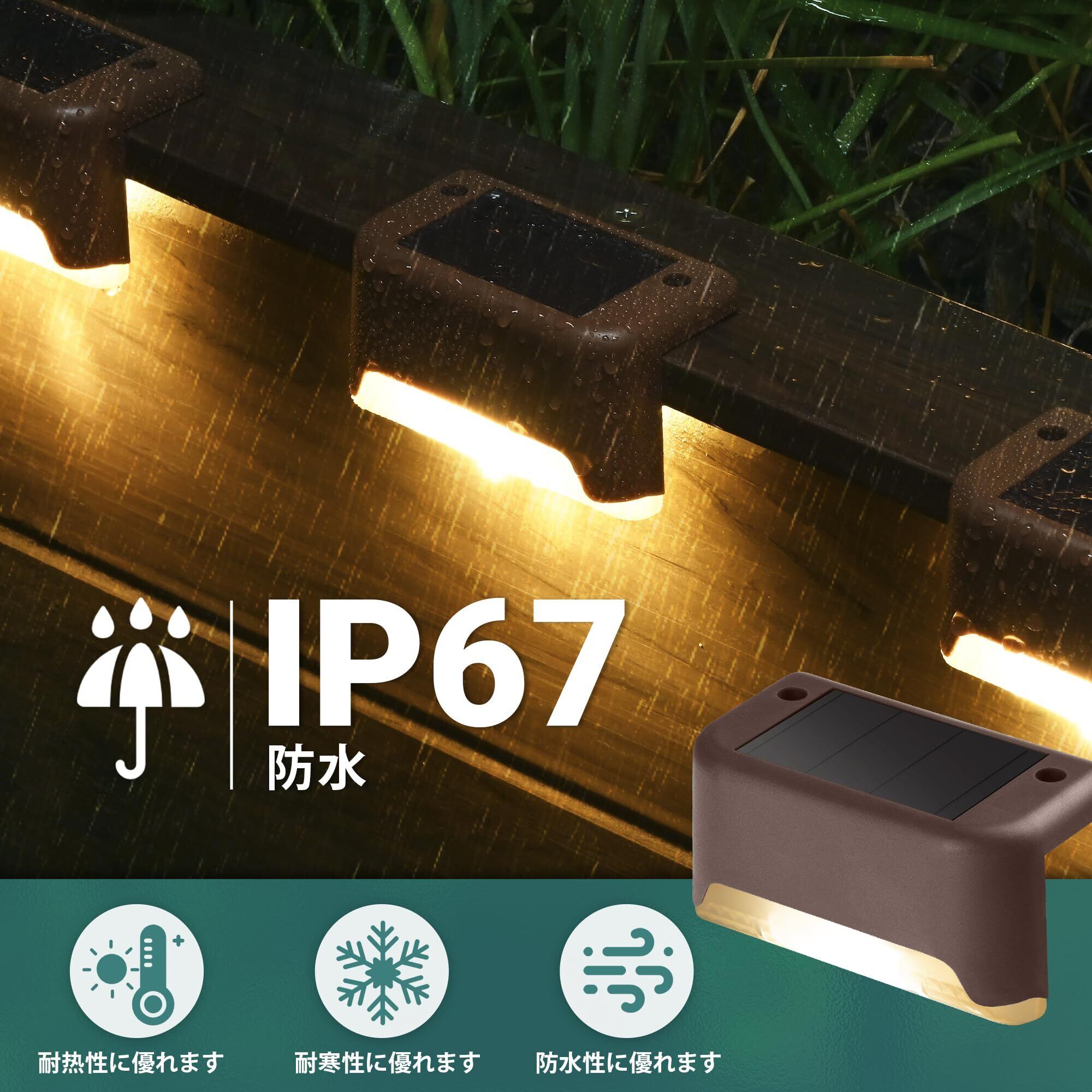 【優れた素材、IP65防水】当社の階段ソーラーライトは、業界で優れた放熱性能を備えた高品質のLED光源チップ、最大93%の太陽光変換率を備えた高品質のポリシリコンソーラーパネルと耐久性のあるABSハウジング、プラスチックプラグスイッチ、ライトセンサー装置で作られます。強風、大雪、砂利、自然災害に耐えることができ、丈夫で耐久性があります。 IP65の防水性能を備えたソーラーライトは悪天候でも対応。破損の心配はありません。安心利用いただけるソーラーライトです。